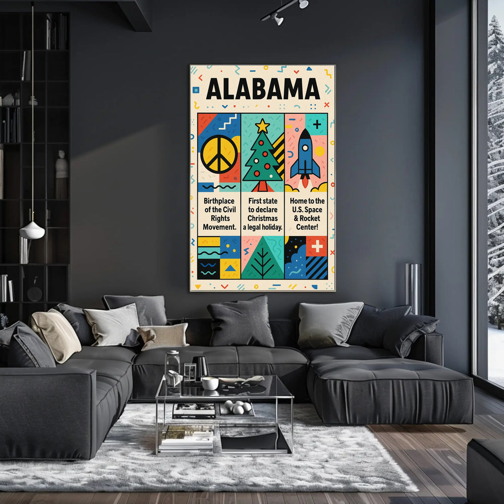 Eye-catching design: Retro-modern illustrations in three vertical panels with a prominent "ALABAMA" header—bright, textured colors and clean black outlines make this piece pop on any wall.