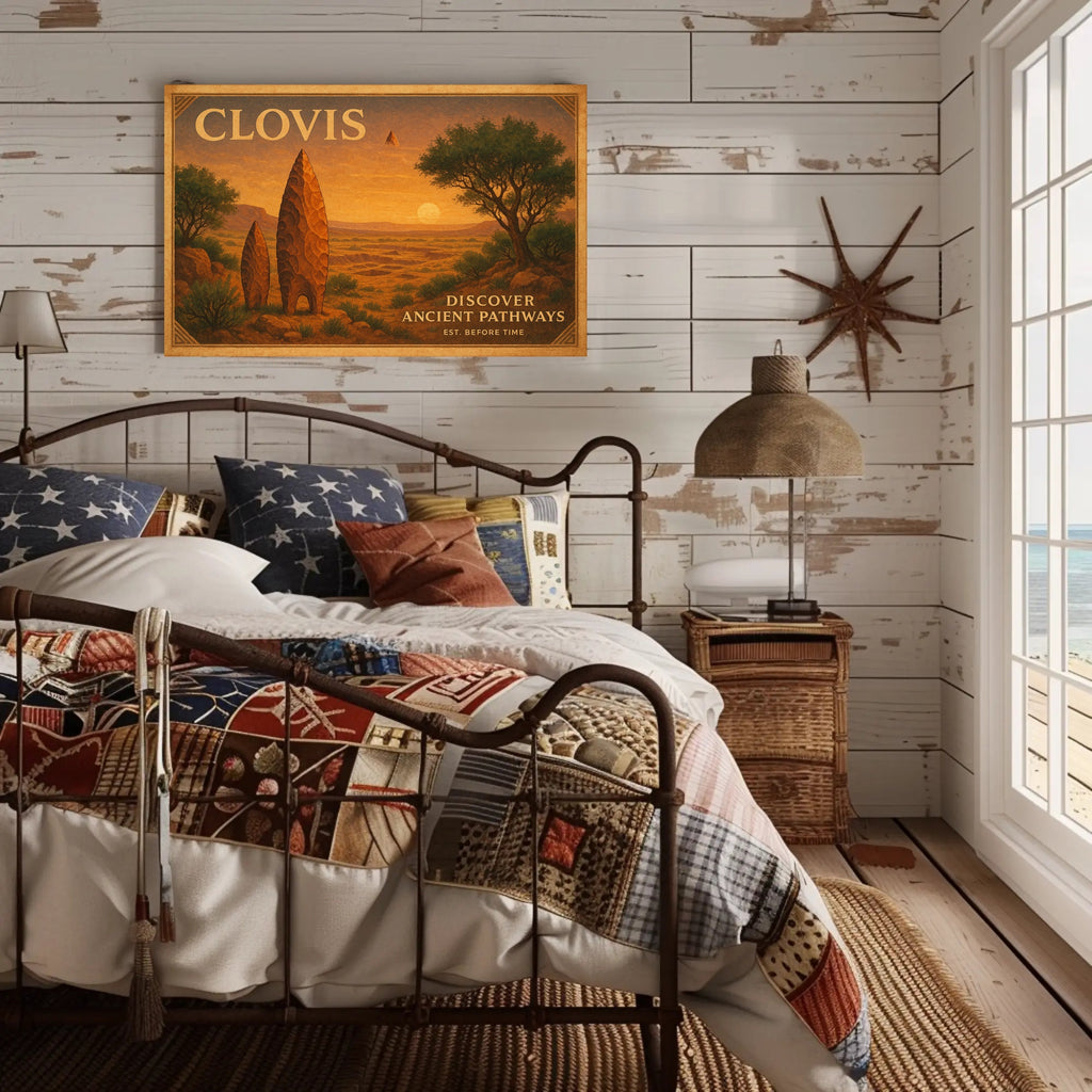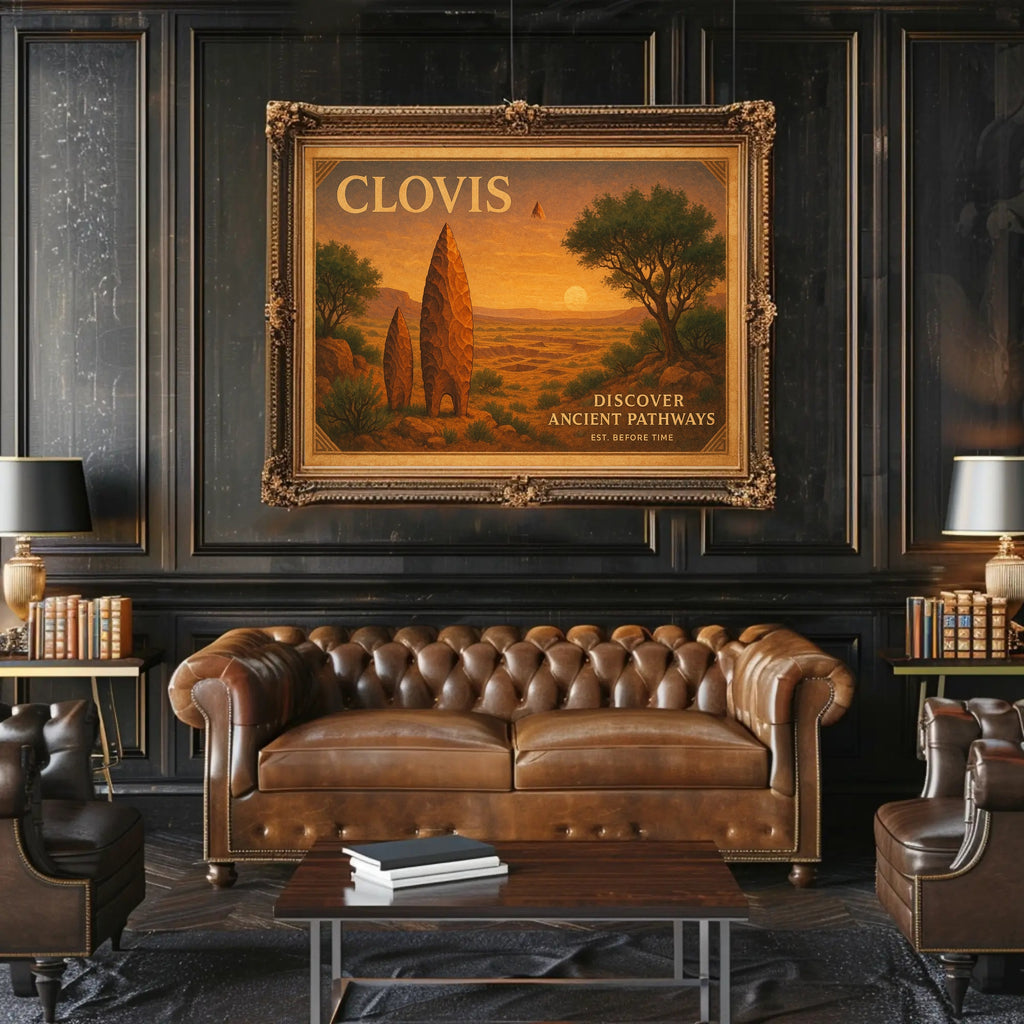 Discover Ancient Pathways from PosterGoat is a vintage-inspired travel poster that brings warm, sunlit landscapes and timeless mystery into your home. Featuring towering Clovis-style stone points set against a golden sunset, sculpted trees, and a wide, textured horizon, this art print evokes exploration, history, and minimalist charm—perfect for living rooms, studios, or office walls.