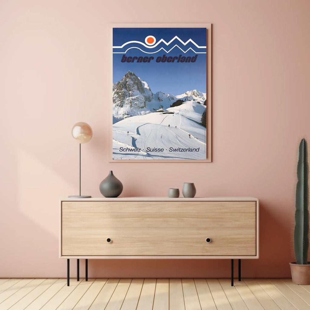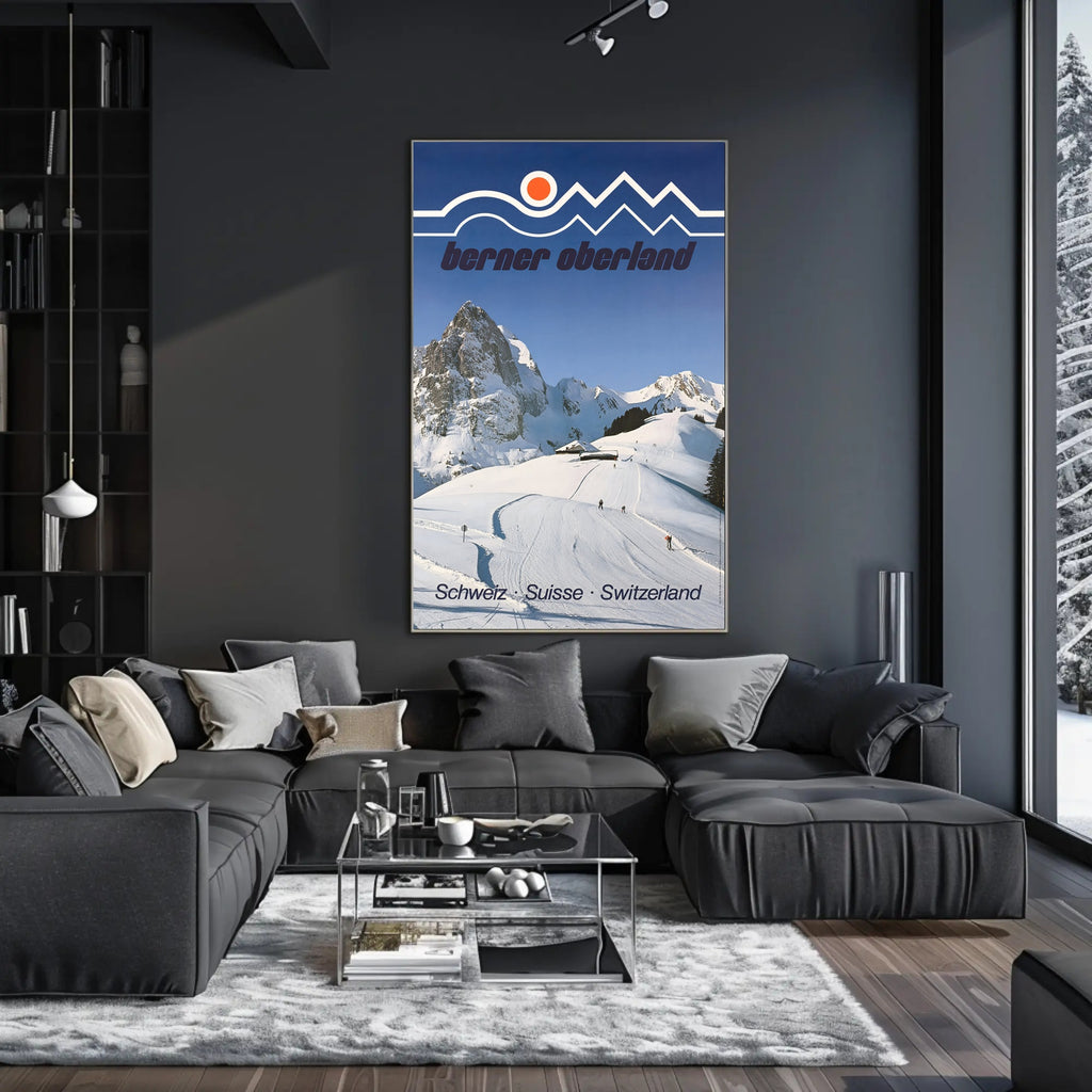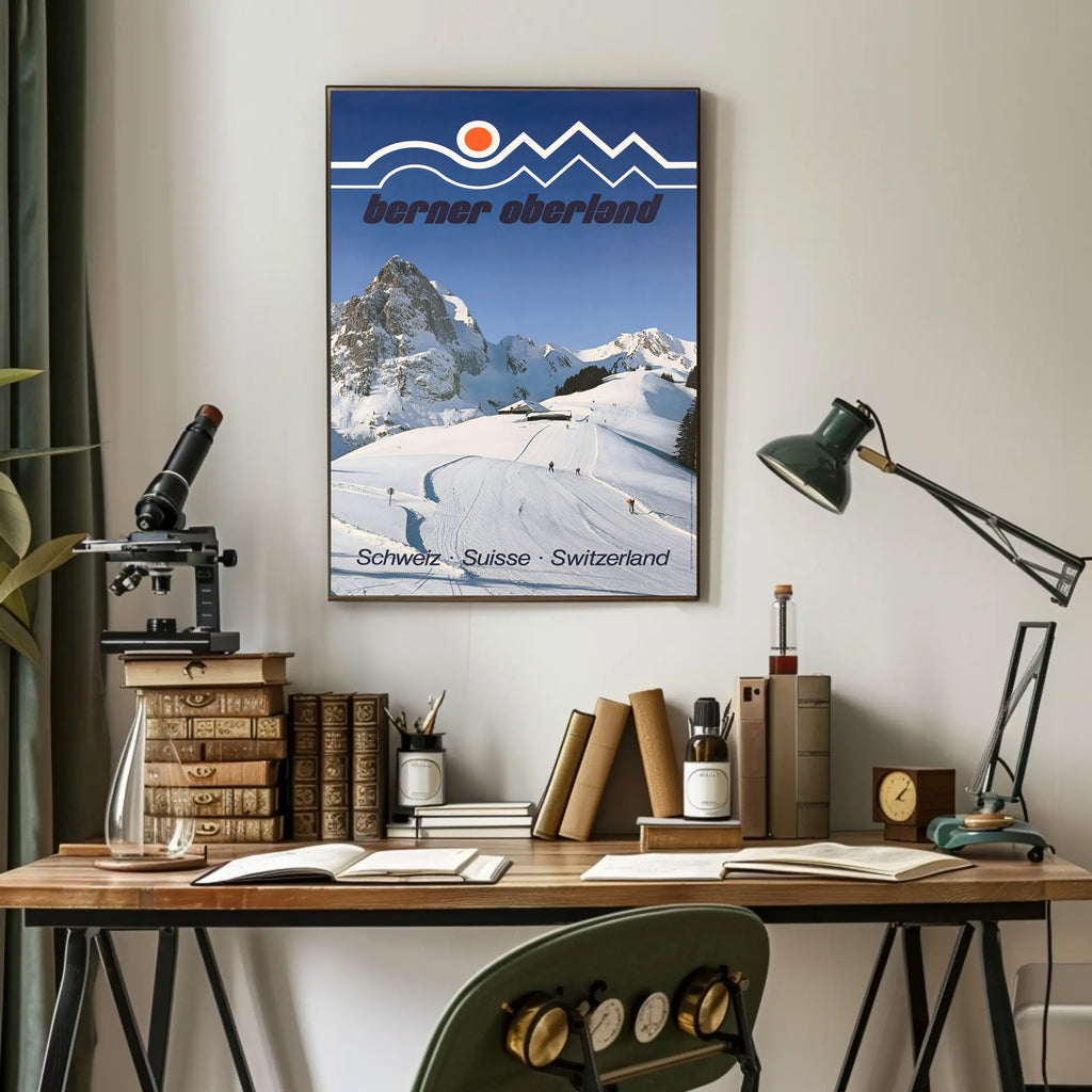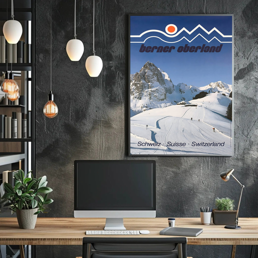 Discover Berner Oberland Poster by PosterGoat—an elegant, minimalist art print that transports your space to the snow‑dusted peaks of Switzerland. This striking poster blends a vintage travel-poster aesthetic with crisp photographic detail: towering alpine cliffs, sunlit slopes, and tiny skiers tracing fresh tracks beneath a bold blue sky.