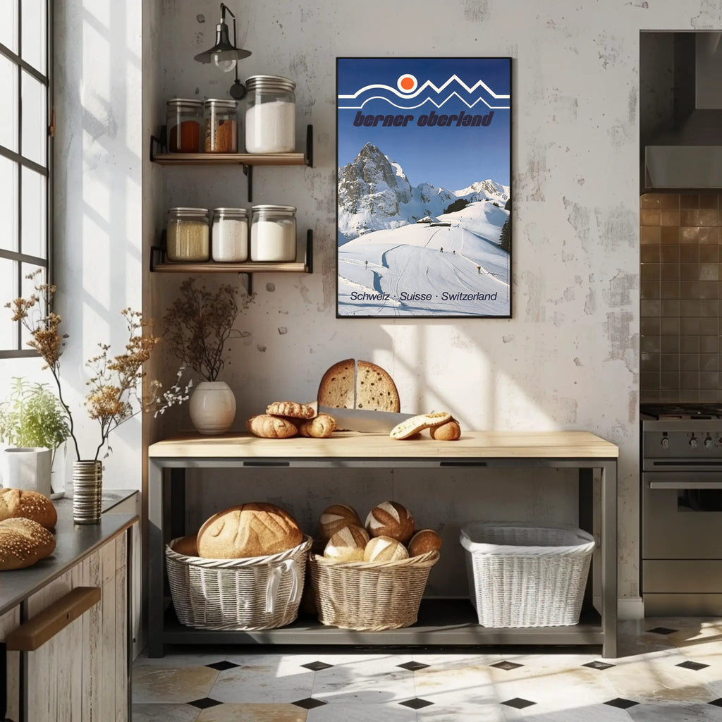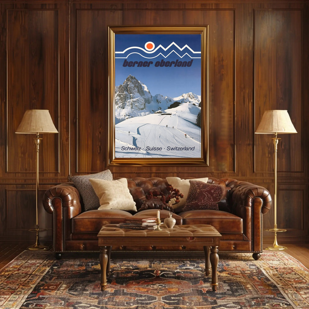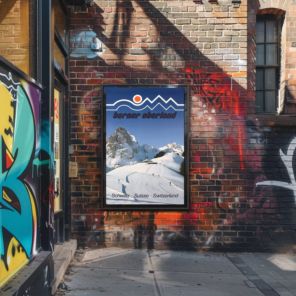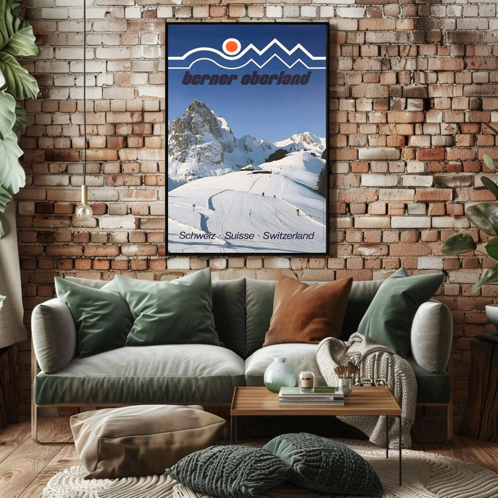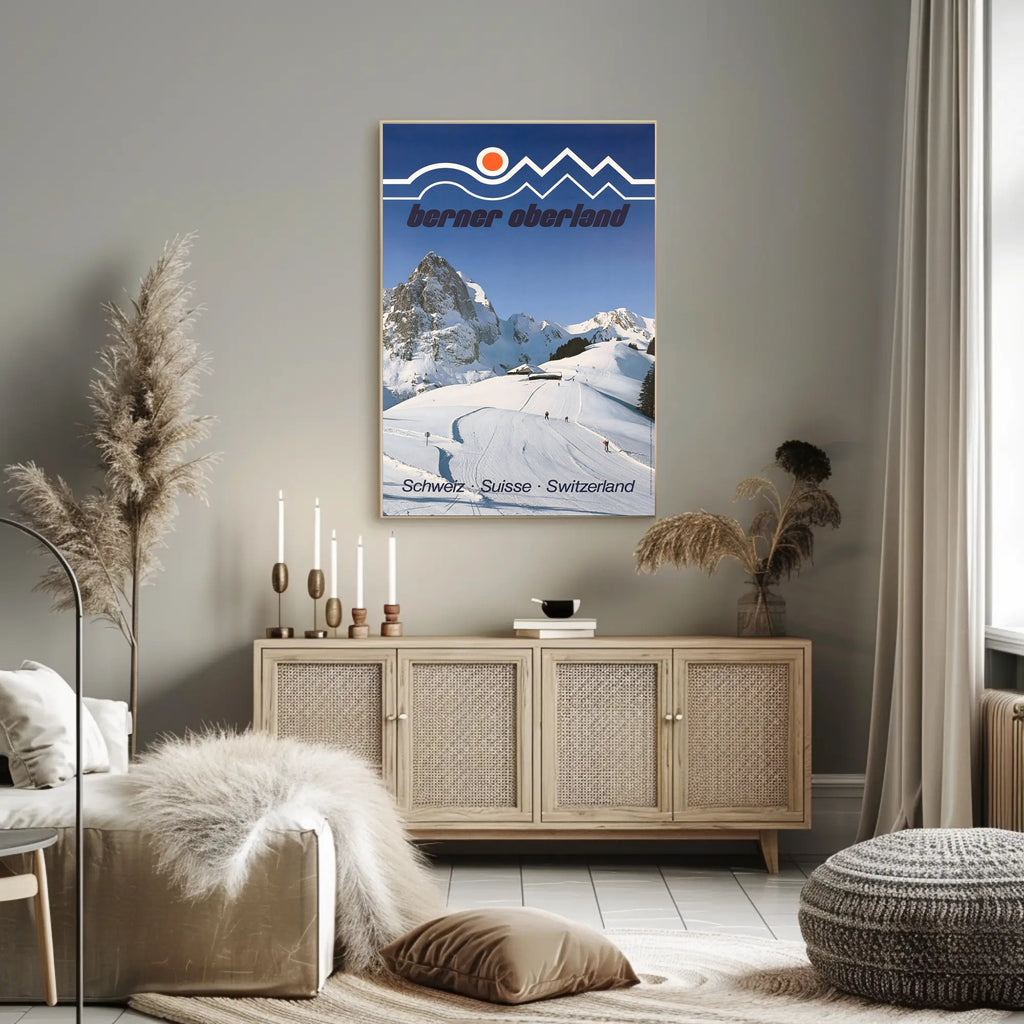 Discover Berner Oberland Poster by PosterGoat—an elegant, minimalist art print that transports your space to the snow‑dusted peaks of Switzerland. This striking poster blends a vintage travel-poster aesthetic with crisp photographic detail: towering alpine cliffs, sunlit slopes, and tiny skiers tracing fresh tracks beneath a bold blue sky.