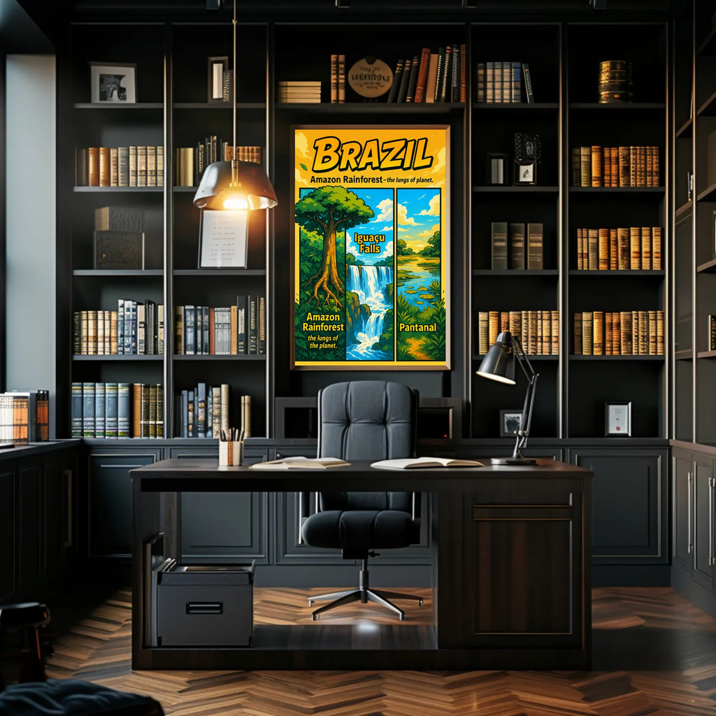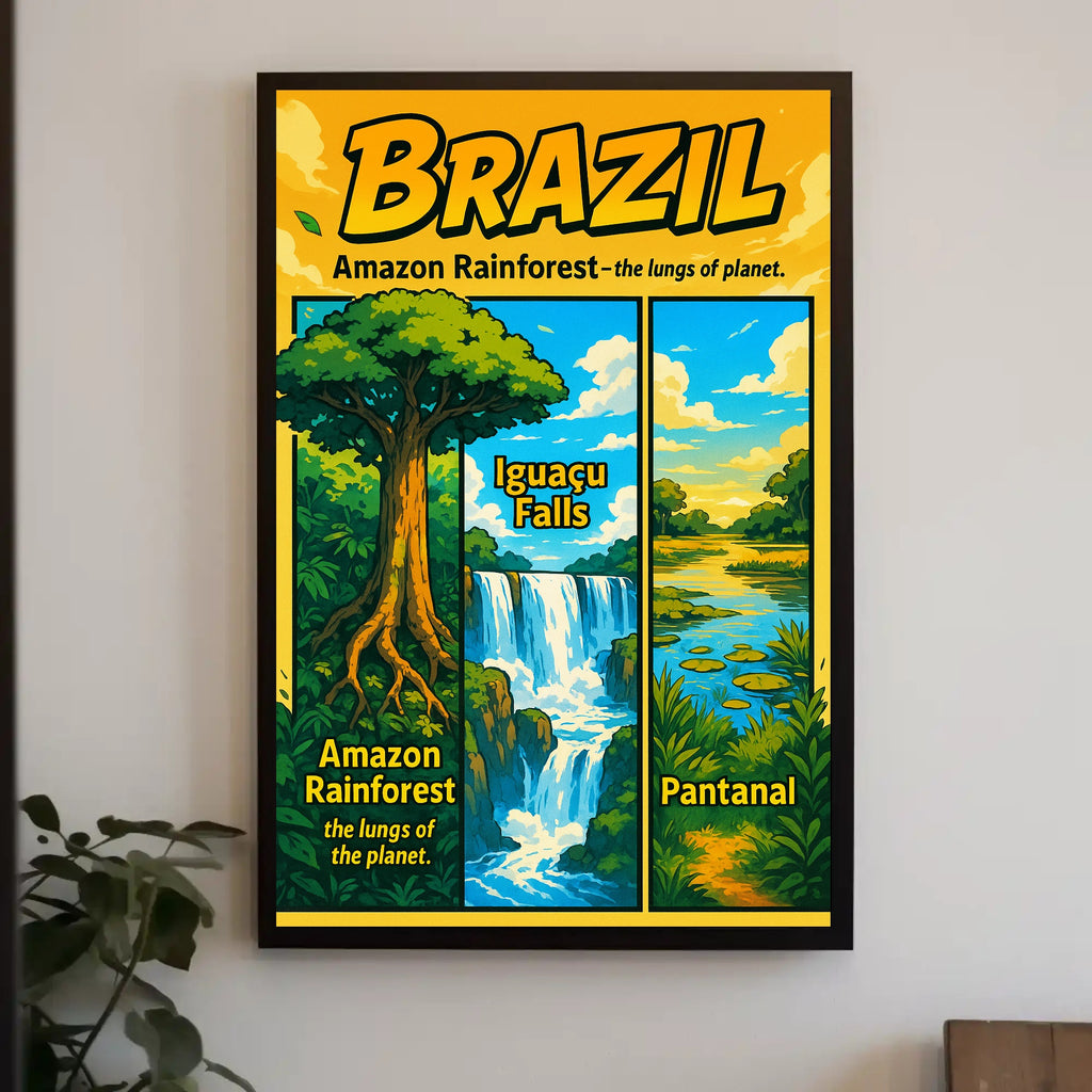 Discover Brazil's Natural Wonders Poster — a vivid travel-inspired print from PosterGoat that brings the Amazon Rainforest, Iguaçu Falls and the Pantanal into one striking, vintage-style triptych. Bold yellow borders and saturated greens and blues create an eye-catching focal point for any room, celebrating Brazil’s most iconic natural landscapes with artistic flair.