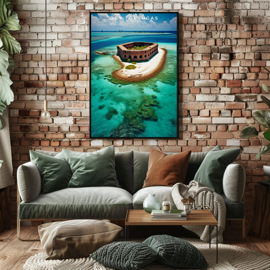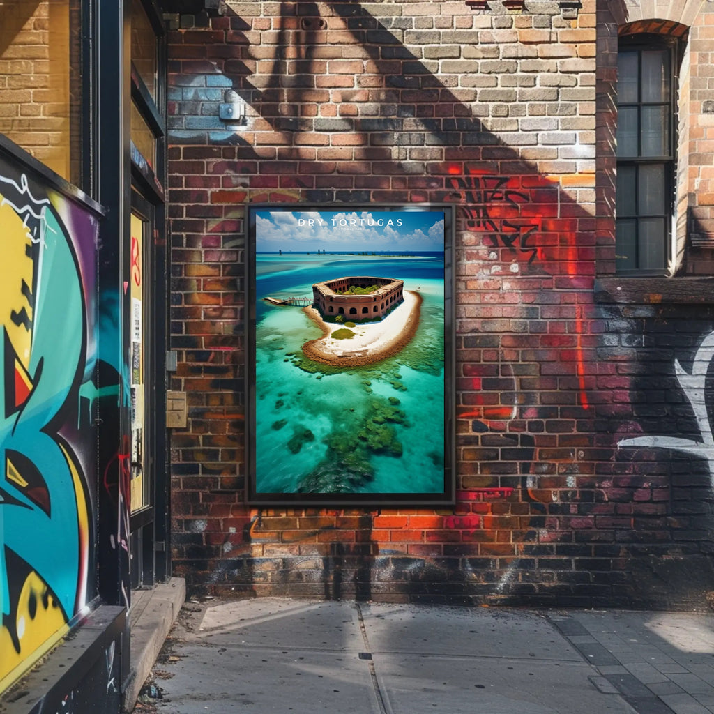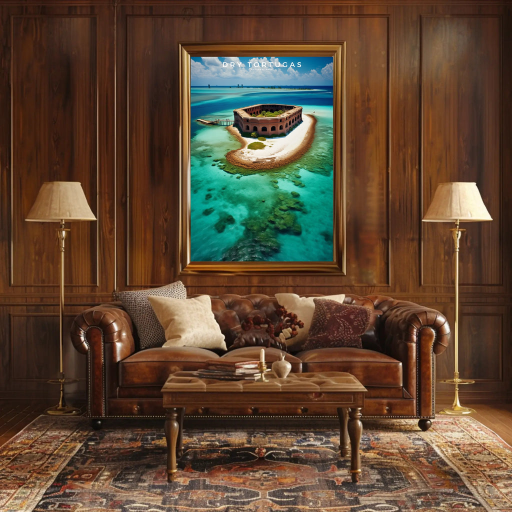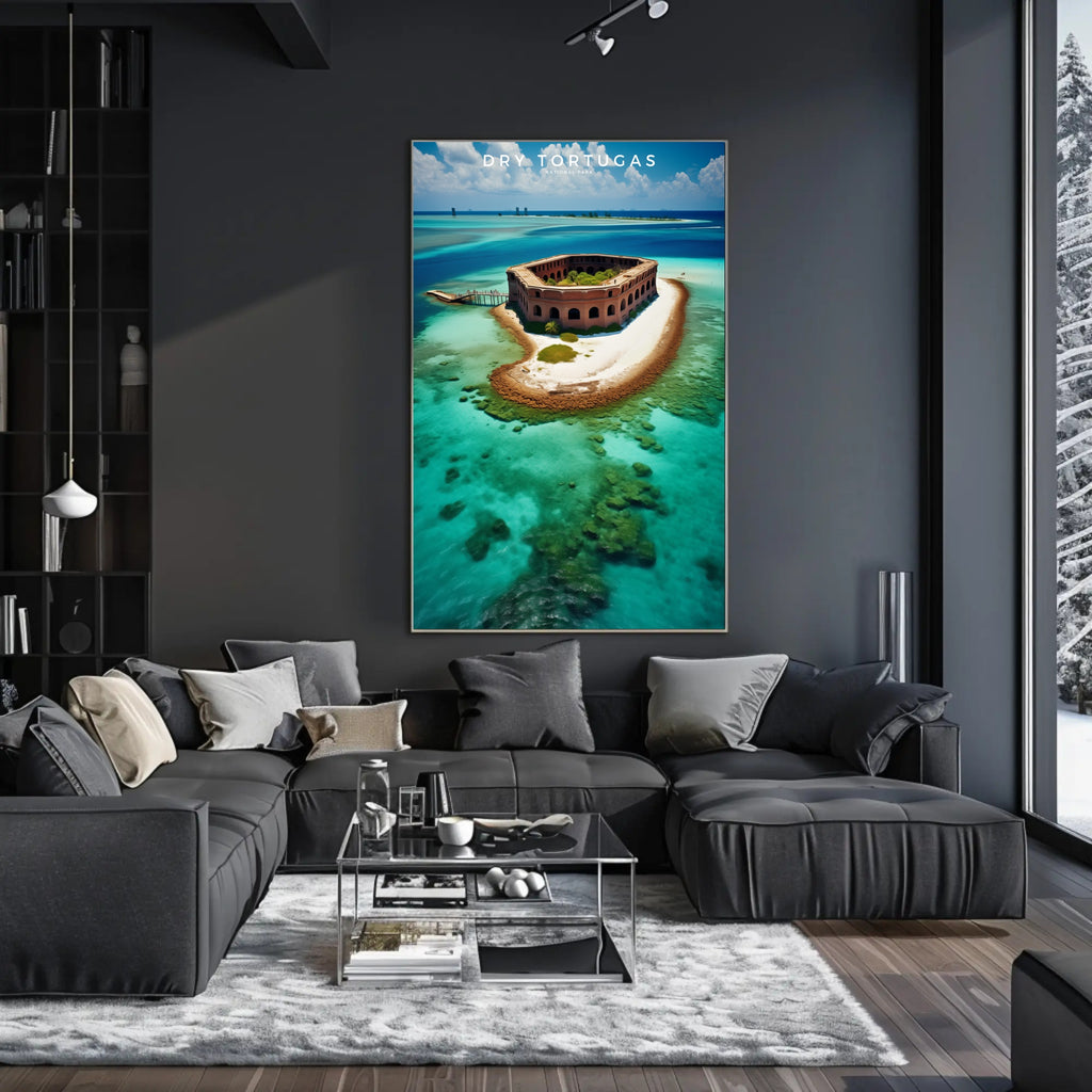 Bring the turquoise clarity and historic charm of Dry Tortugas National Park into your home with this vintage-style travel poster from PosterGoat. A dramatic aerial composition highlights Fort Jefferson surrounded by shallow reefs, white sand, and striking tropical hues — an eye-catching piece that transforms any wall into a coastal getaway.