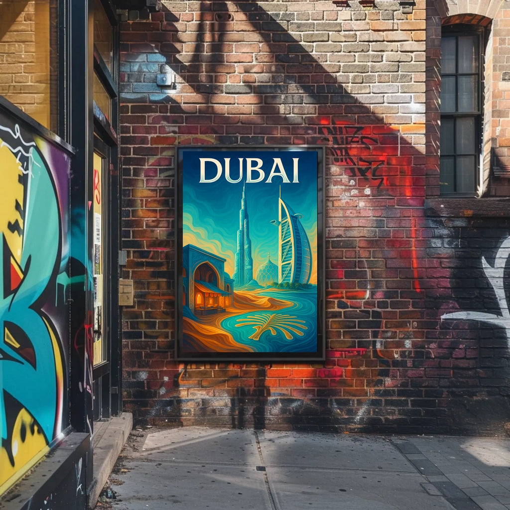 Immerse yourself in the vibrant allure of Dubai with this striking poster that blends modern marvels with timeless charm. From the glittering skyline to the serene desert backdrop, it captures the energy and elegance of a city known for innovation and culture.