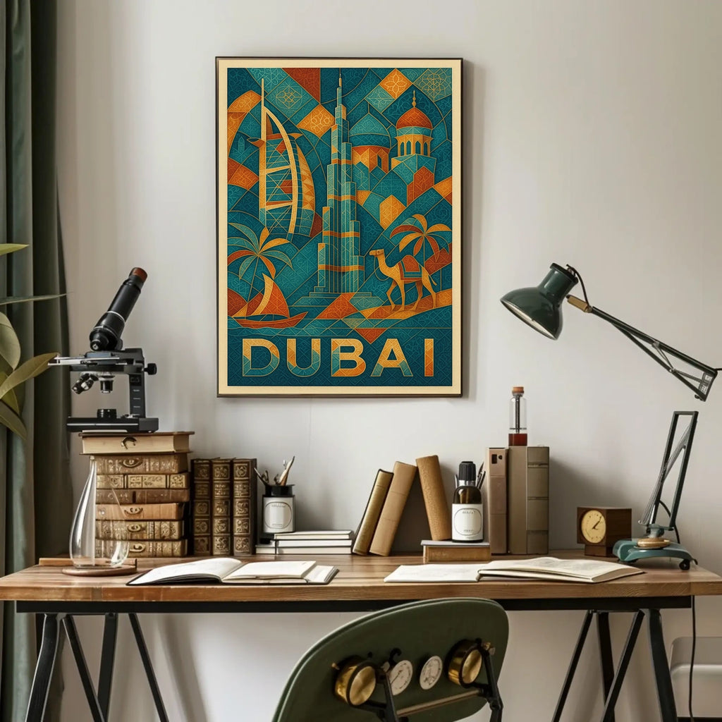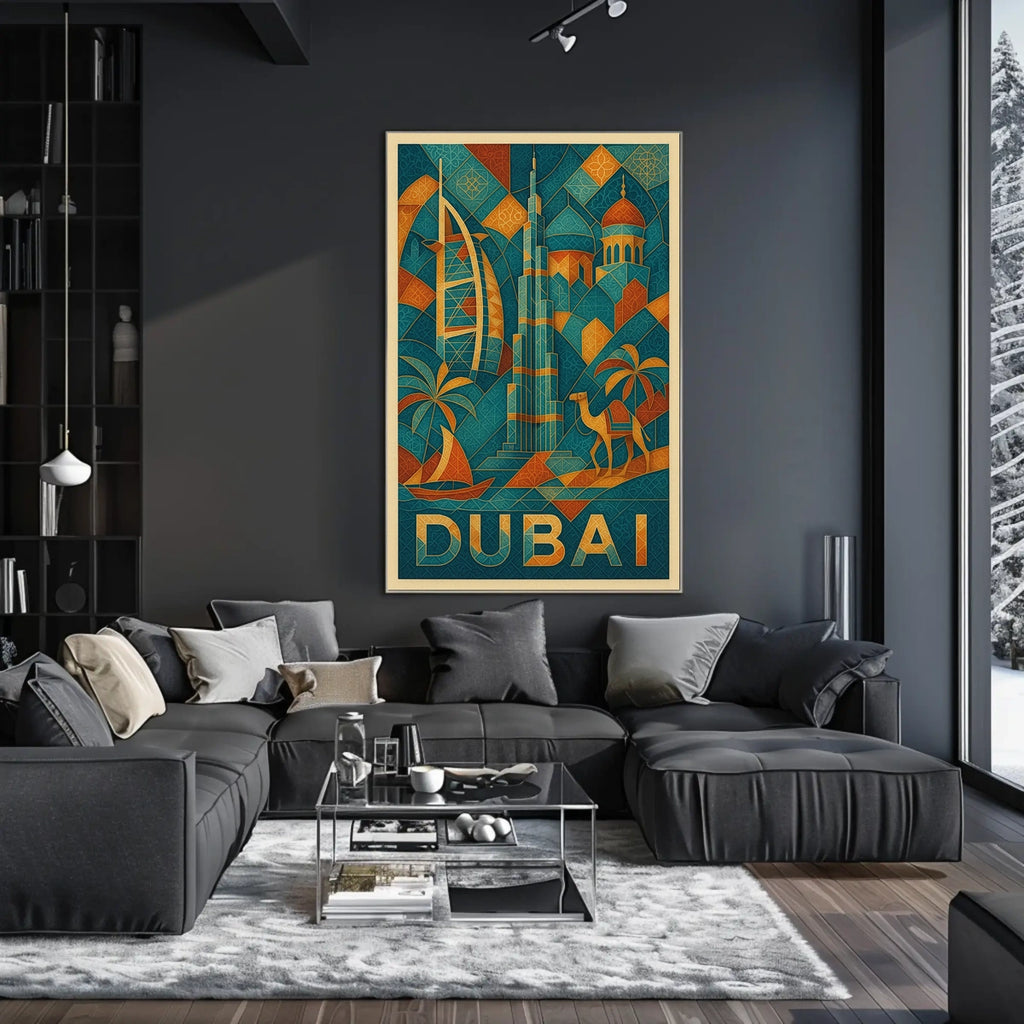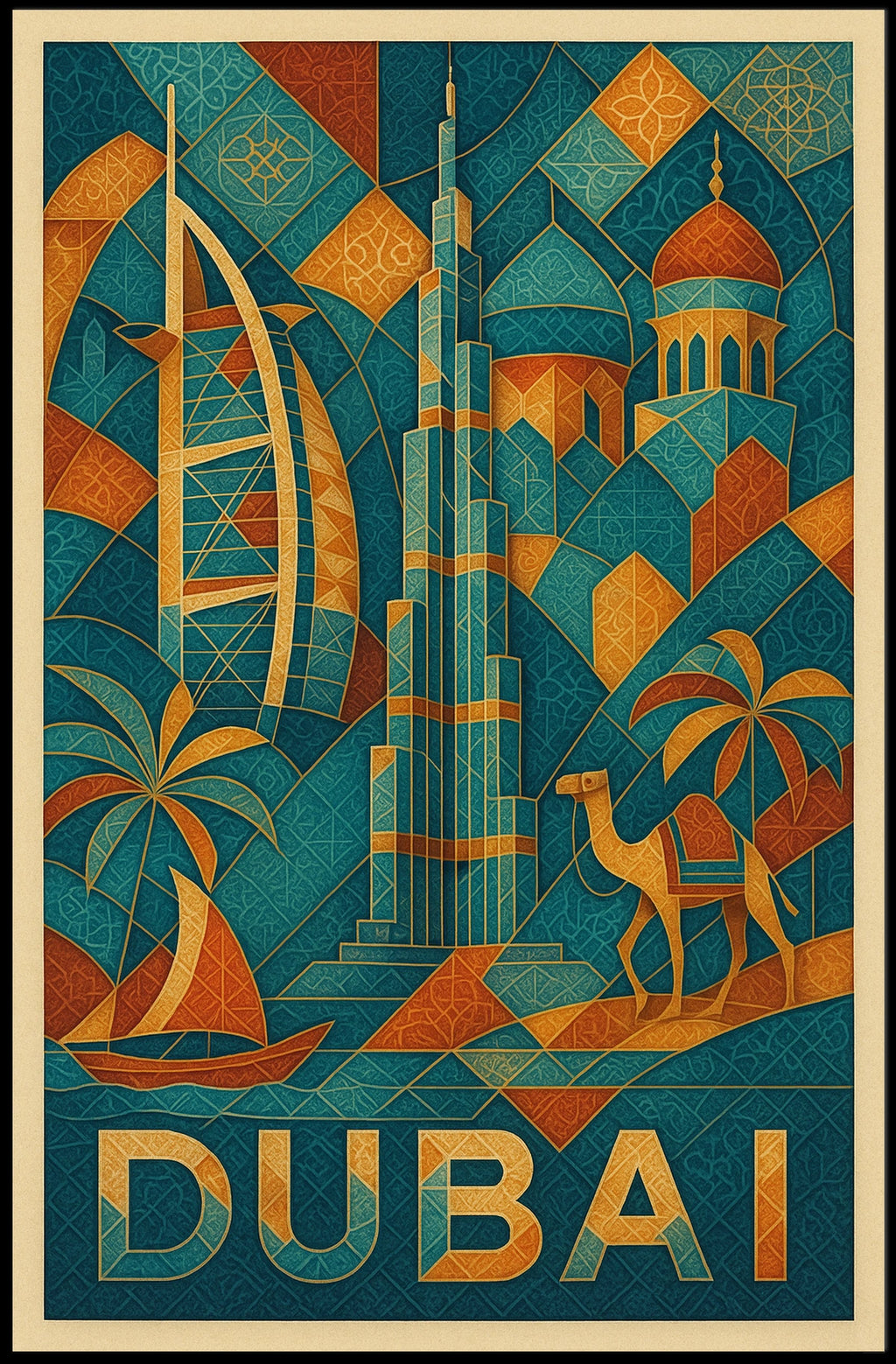 Celebrate Dubai's dynamic blend of tradition and modernity with this vibrant poster. It captures iconic landmarks and timeless cultural elements in a warm, inviting composition perfect for living spaces, studios, or offices.