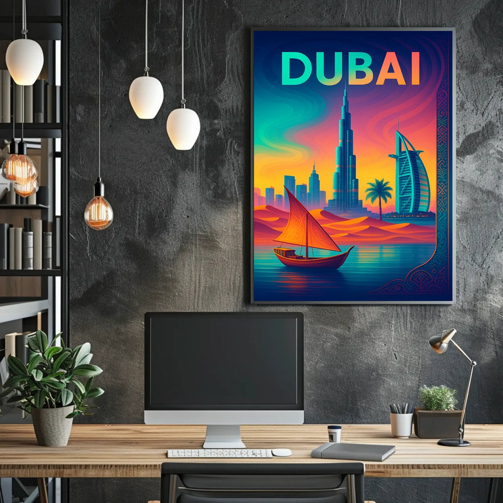 Experience Dubai's dynamic blend of heritage and progress with this striking poster. The scene brings together iconic landmarks and desert sunsets, inviting you to explore a city where tradition meets cutting-edge architecture. Perfect for travelers, design lovers, and anyone drawn to bold, cinematic artwork that sparks conversation.