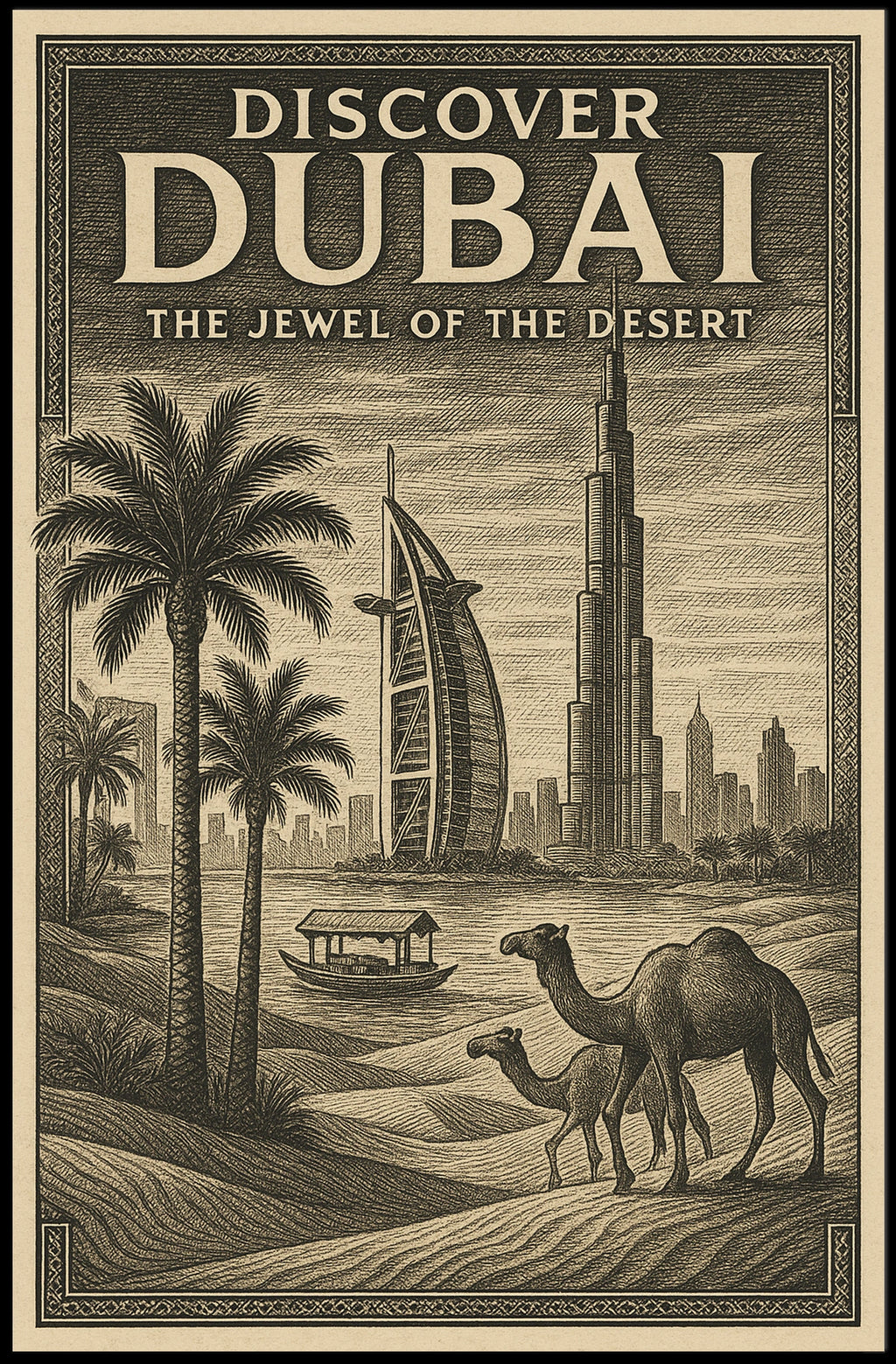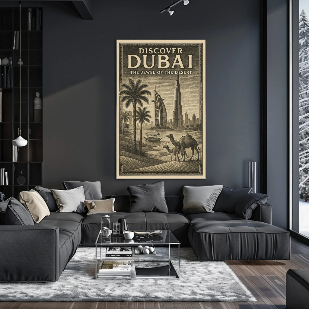 Discover Dubai The Jewel of the Desert is a captivating poster inviting you to explore a city where modern marvels meet timeless desert landscapes. It features iconic skyscrapers, serene palm trees, and majestic camels, capturing the essence of a vibrant metropolis in the heart of the desert. Experience this fusion of tradition and innovation in your space.