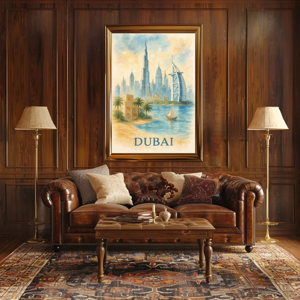 - Vibrant watercolor palette brings Dubai’s glow to life, adding warm energy and depth to any room.