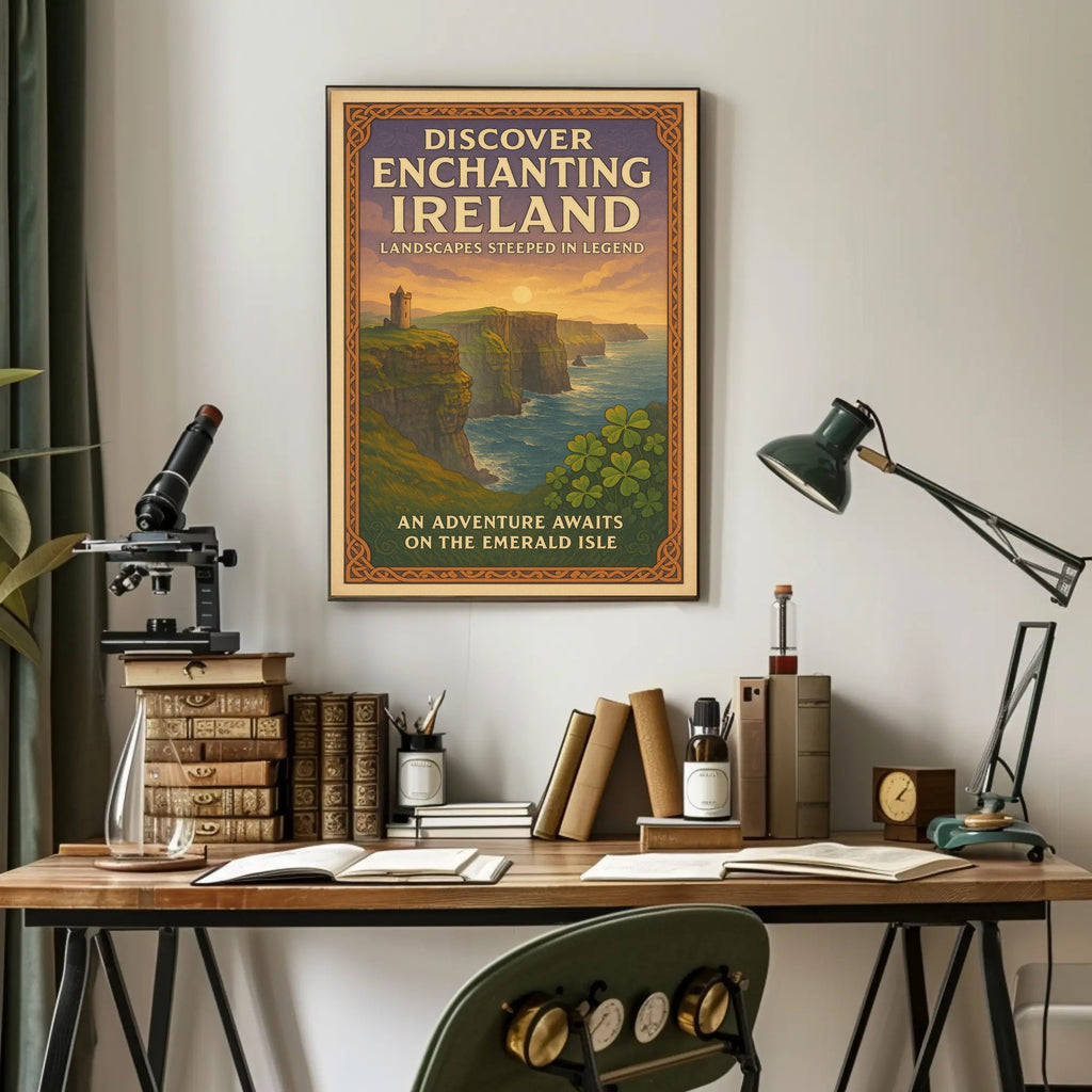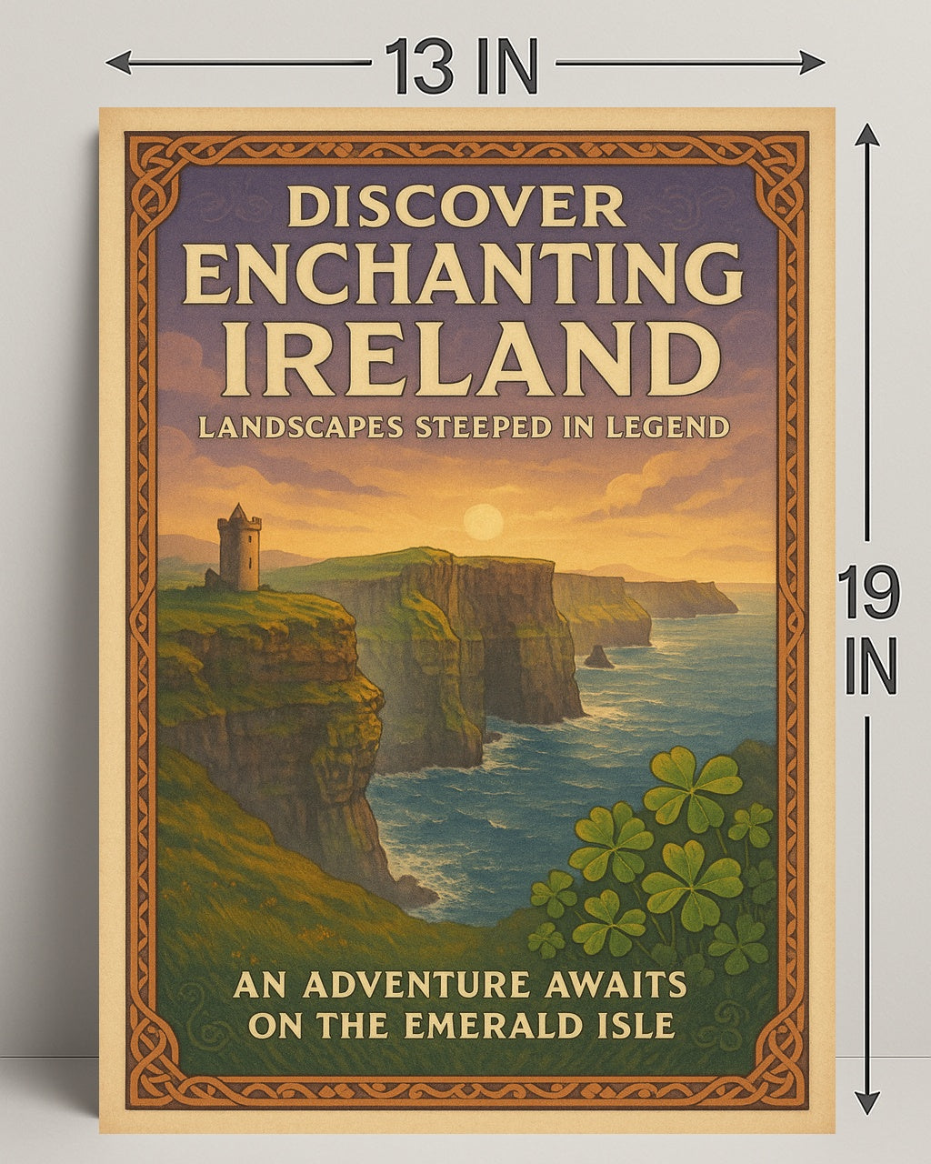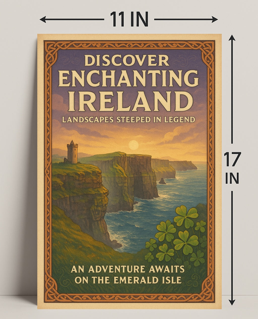 Discover Enchanting Ireland Wall Art Print from PosterGoat brings the romance of the Emerald Isle into your home with a vintage travel-poster aesthetic that celebrates Ireland's rugged cliffs, misty sunsets, and timeless legends.
