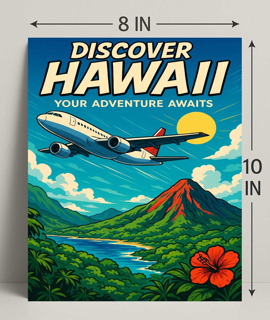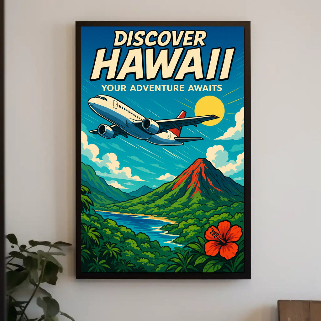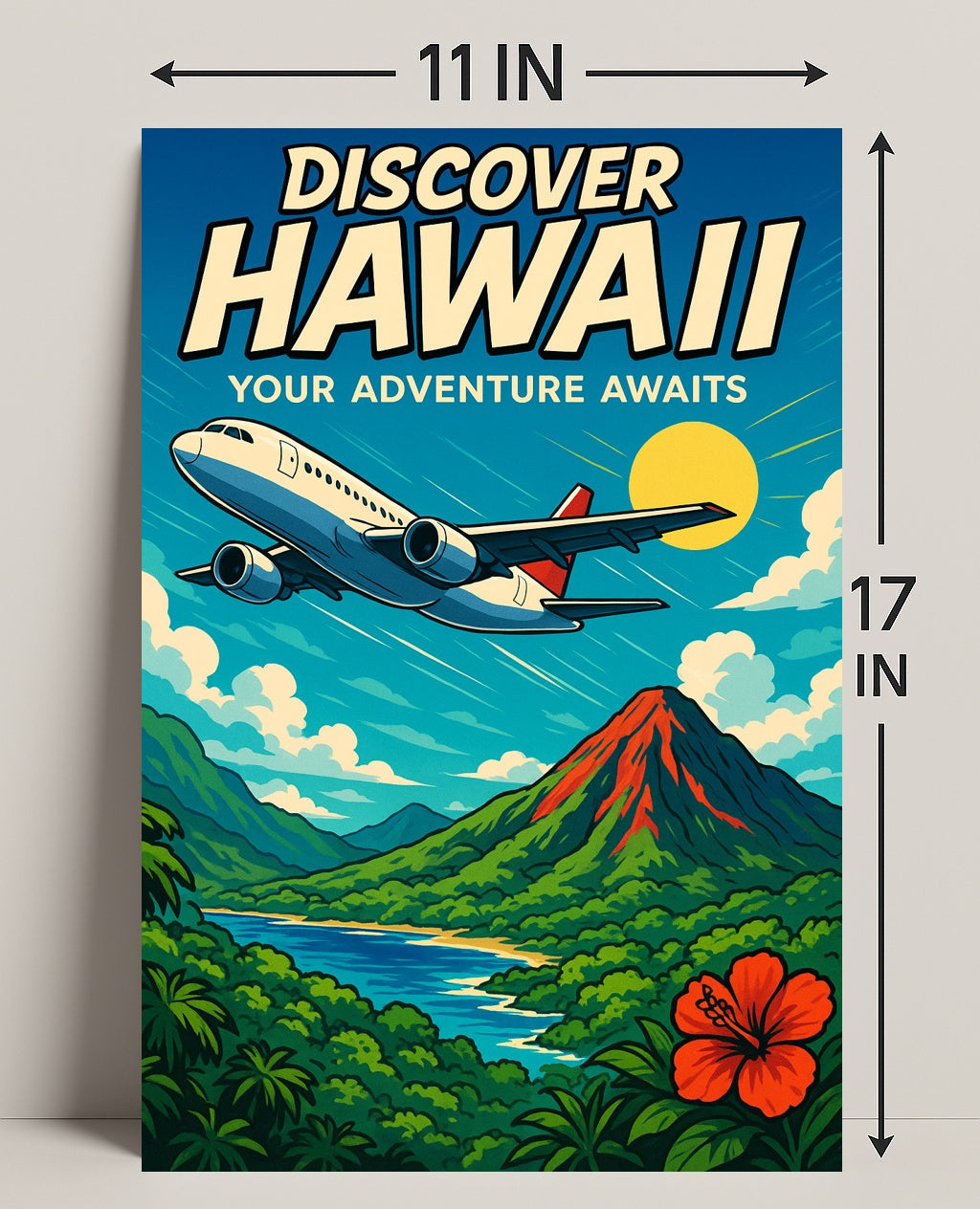Bring island wanderlust to any room with the Discover Hawaii Travel Poster Art Print from PosterGoat. This vibrant, retro-inspired travel poster features a soaring airplane, a sunlit sky, dramatic volcanic peak, lush green coastline and a bold hibiscus blossom—an instant focal point that invites adventure and brightens walls with tropical color.