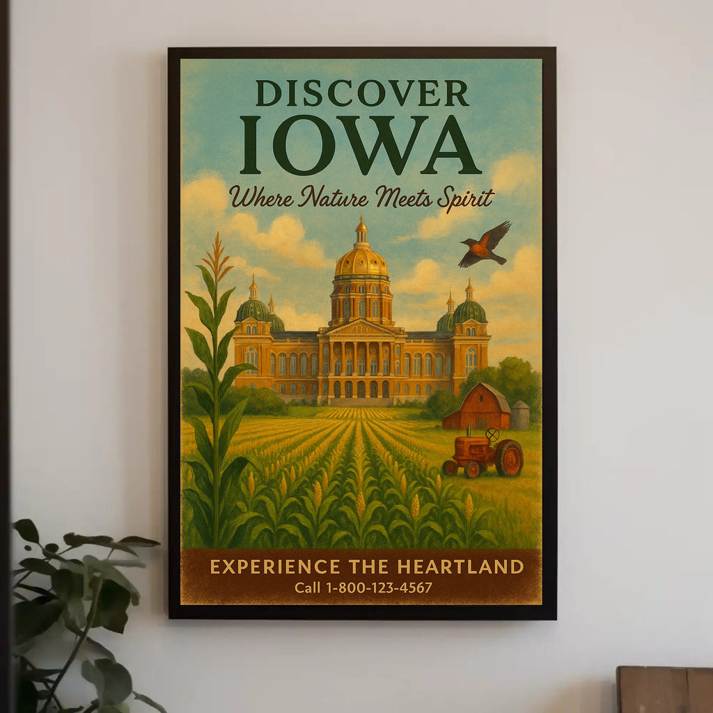 This Discover Iowa poster brings scenic wall art and vintage travel charm together — perfect for creating a warm, nostalgic atmosphere. Add it to your space today and experience the Heartland every day.
