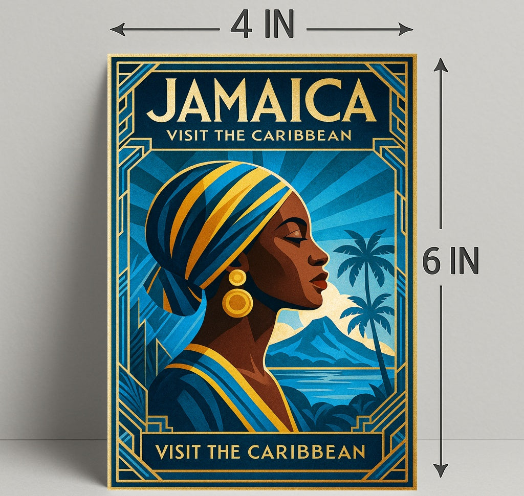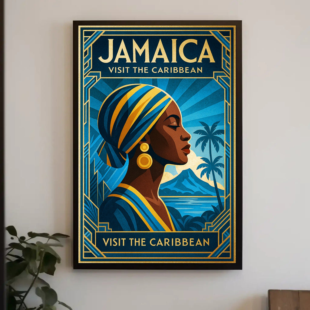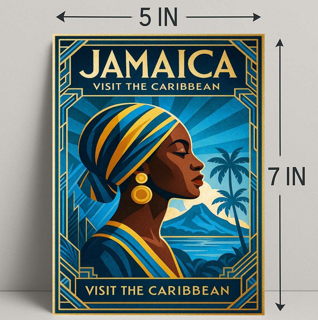 Discover Jamaica — Visit the Caribbean from PosterGoat is a striking vintage-collage poster that brings island color, culture, and calm into any living space. Rich blue tones, gilded art-deco borders, and the proud profile of a woman framed against palm trees and volcanic peaks create an evocative travel-inspired artwork that doubles as decor and a conversation piece.