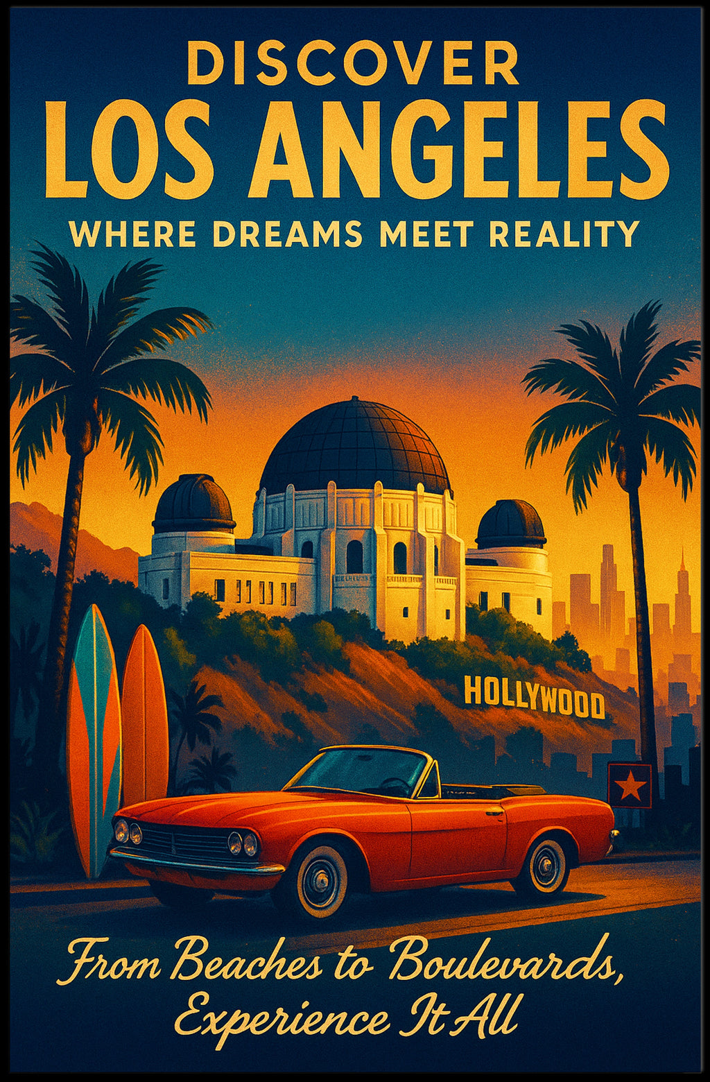 Capture the sun-soaked spirit of Southern California with the Discover Los Angeles Poster from PosterGoat. This vintage-inspired travel print features a classic red convertible parked beneath towering palm trees, colorful surfboards, and the iconic Griffith Observatory set against a warm orange-and-teal sunset — a nostalgic tribute to LA's beaches, boulevards, and Hollywood dreams.