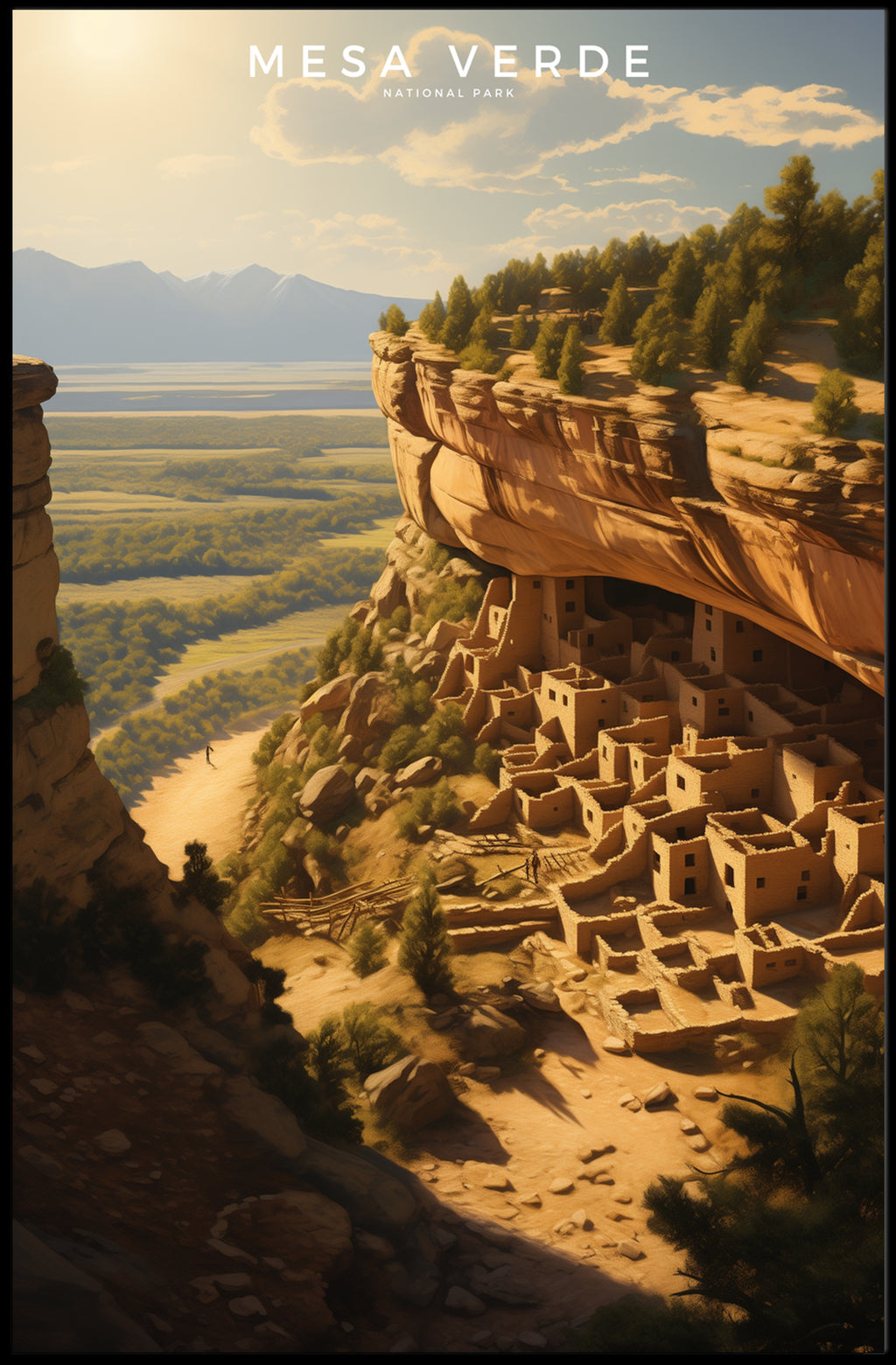 - Immersive landscape illustration: Detailed depiction of Mesa Verde's cliff dwellings tucked beneath towering rock ledges, framed by distant mountains and a sunlit valley — perfect for lovers of landscape and travel art.