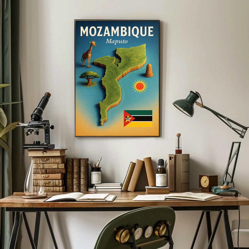 Bring a slice of Southern Africa into your home with the Discover Mozambique poster from PosterGoat — a vibrant travel-style art print that celebrates Maputo and Mozambique’s coastal charm. This minimalist, vintage-inspired poster features a sculpted 3D map, iconic symbols like a giraffe, baobab-like tree, coastal lighthouse and national flag, all set against a sun-washed ocean backdrop that pops on any wall.