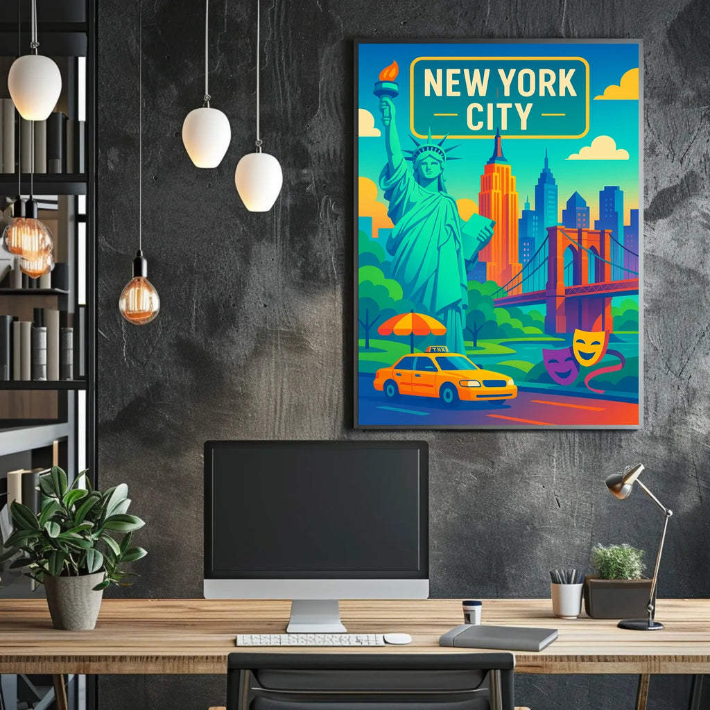 Immerse yourself in the heart of New York City with this eye-catching poster that celebrates iconic landmarks and the city’s vibrant culture. This NYC poster blends a dynamic cityscape with timeless travel art, perfect for fans of urban decor and big‑apple energy.