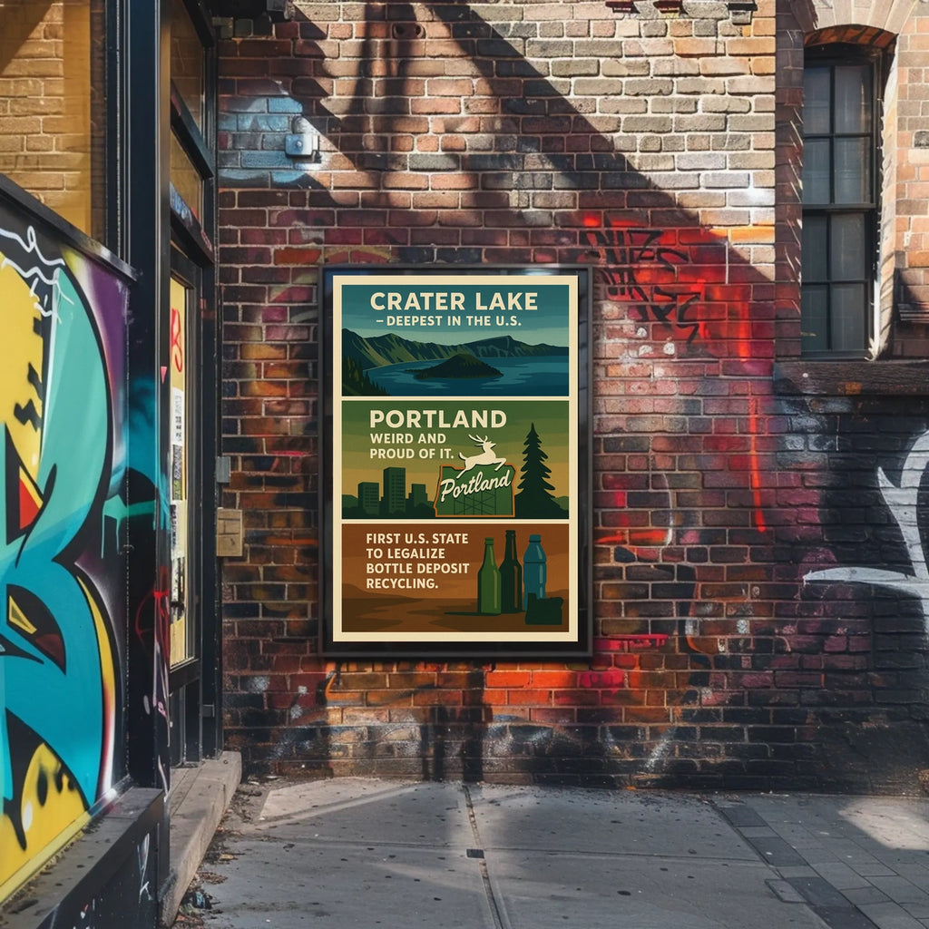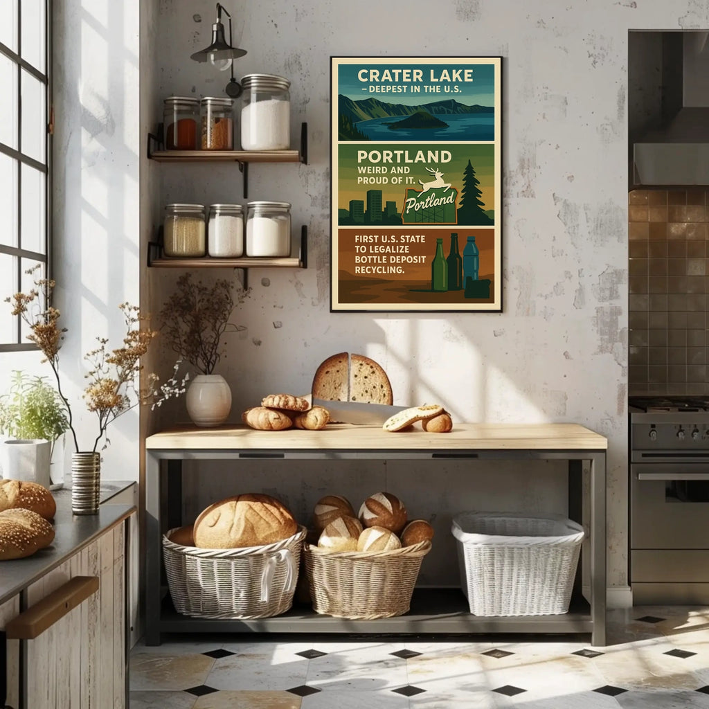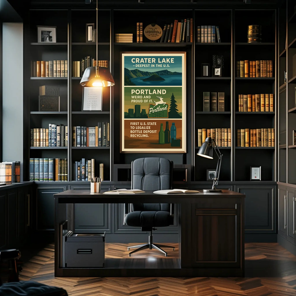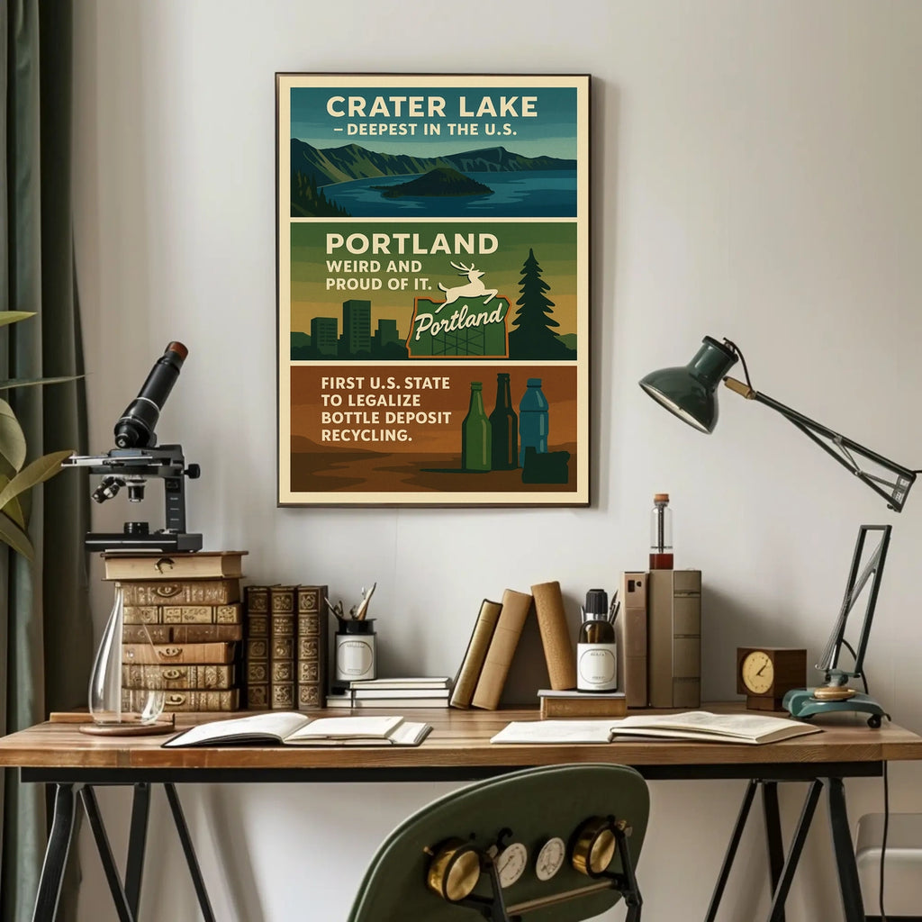 Capture the awe of Oregon's famed Crater Lake and Portland highlights with this decorative poster. Crafted for travelers and design lovers, it brings real-world scenery into your home with calming blues, earthy tones, and modern art flair.