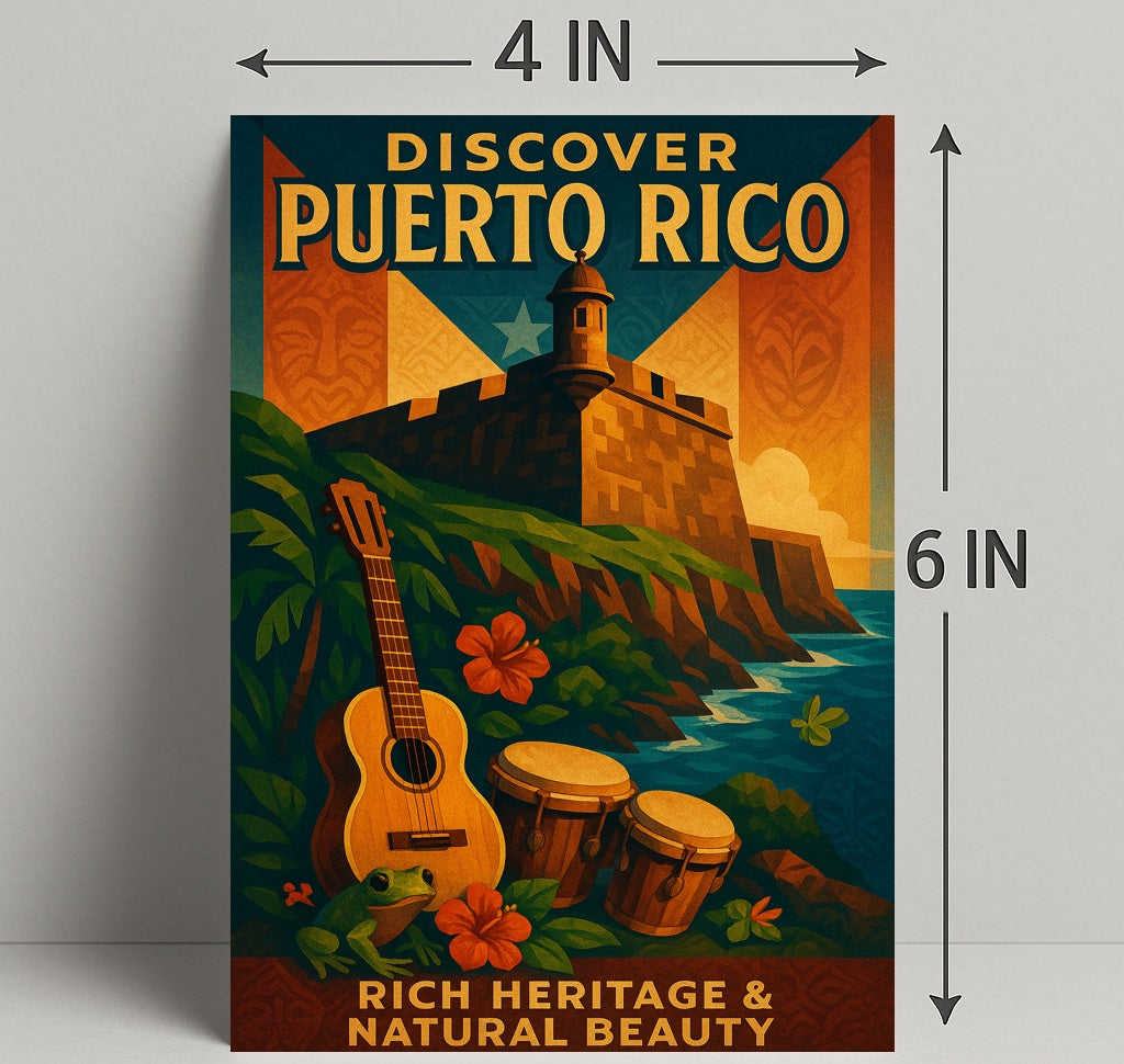 Scenic Imagery: Featuring iconic landscapes, this poster showcases the breathtaking beauty of Puerto Rico's coastlines and heritage sites.