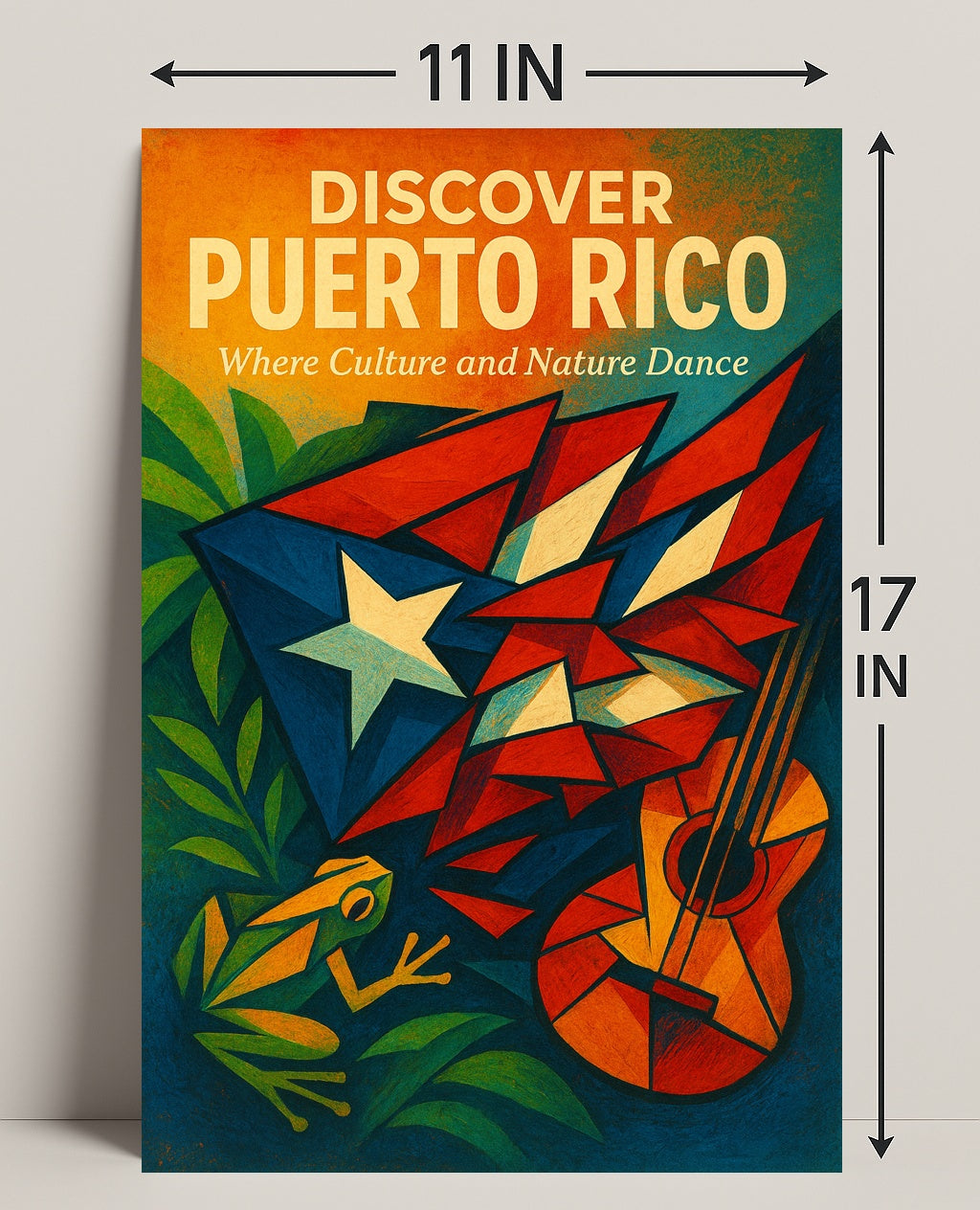 Bring the vibrant spirit of the island into your home with the Discover Puerto Rico Wall Art Print from PosterGoat. This eye-catching poster blends bold, geometric illustration with warm tropical tones—featuring a stylized Puerto Rican star, a festive guitar, lush foliage and a lively frog—to celebrate the culture and natural beauty of Puerto Rico.