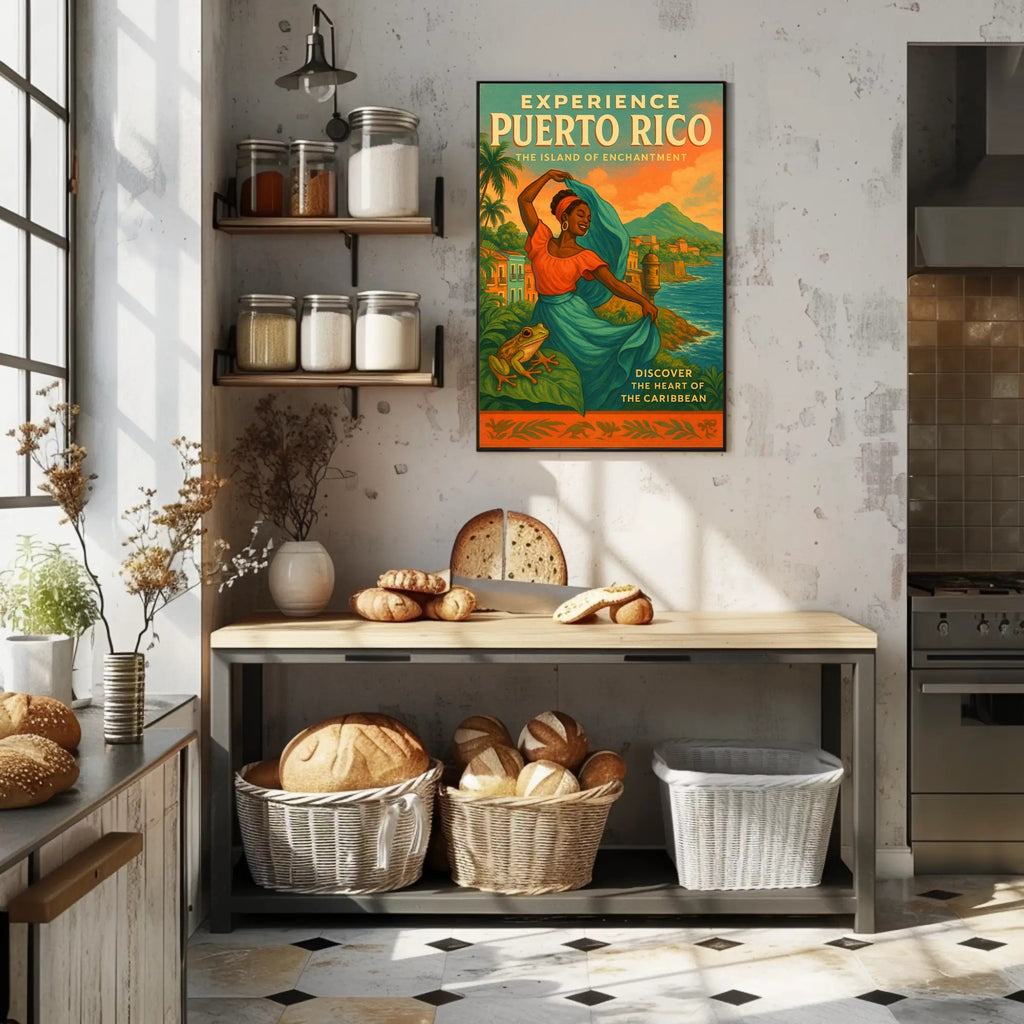 Experience the vibrant allure of Puerto Rico with this stunning travel poster from PosterGoat. Portraying the island's enchanting spirit, this artwork features a joyful woman dancing in vivid attire amidst a backdrop of lush greenery, palm trees, and colonial architecture. It's more than just a decoration; it’s a celebration of Puerto Rico's rich culture and history.