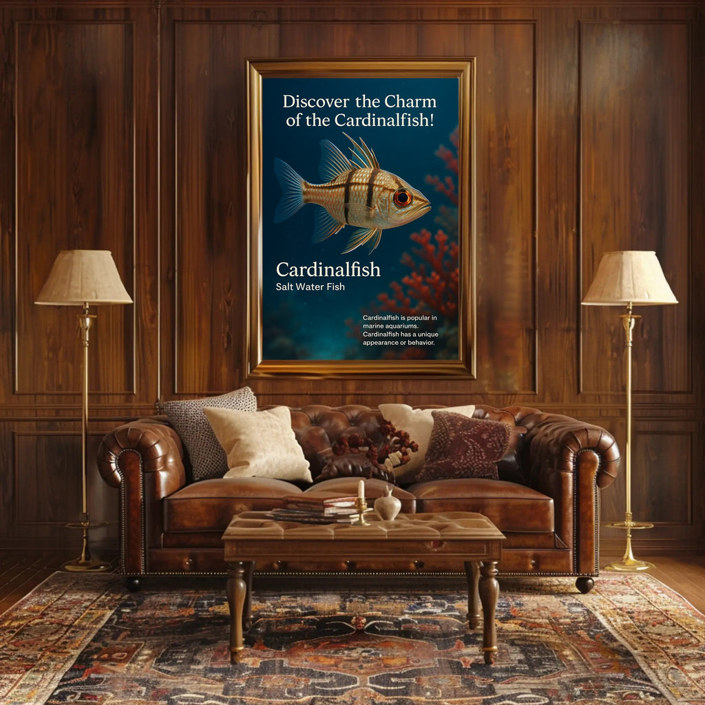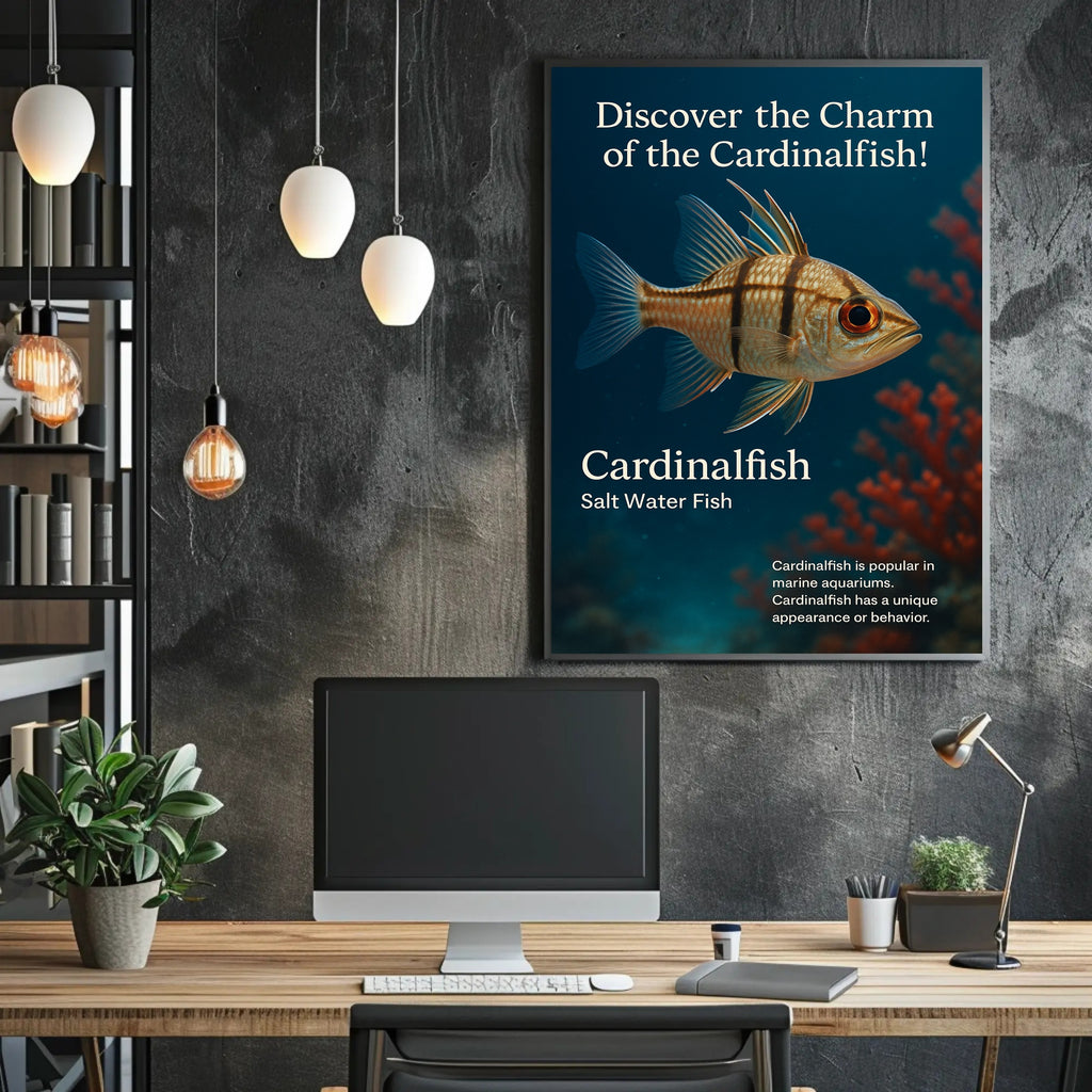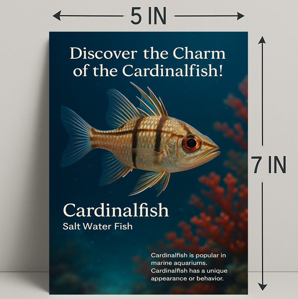 Bring the ocean home with PosterGoat’s “Discover the Charm of the Cardinalfish” poster — a striking art print that captures a detailed cardinalfish floating against a deep-blue seascape with soft coral bokeh. Its lifelike texture, warm amber eye and delicate fin outlines create a calming focal point for living rooms, offices, nurseries or marine-themed spaces.