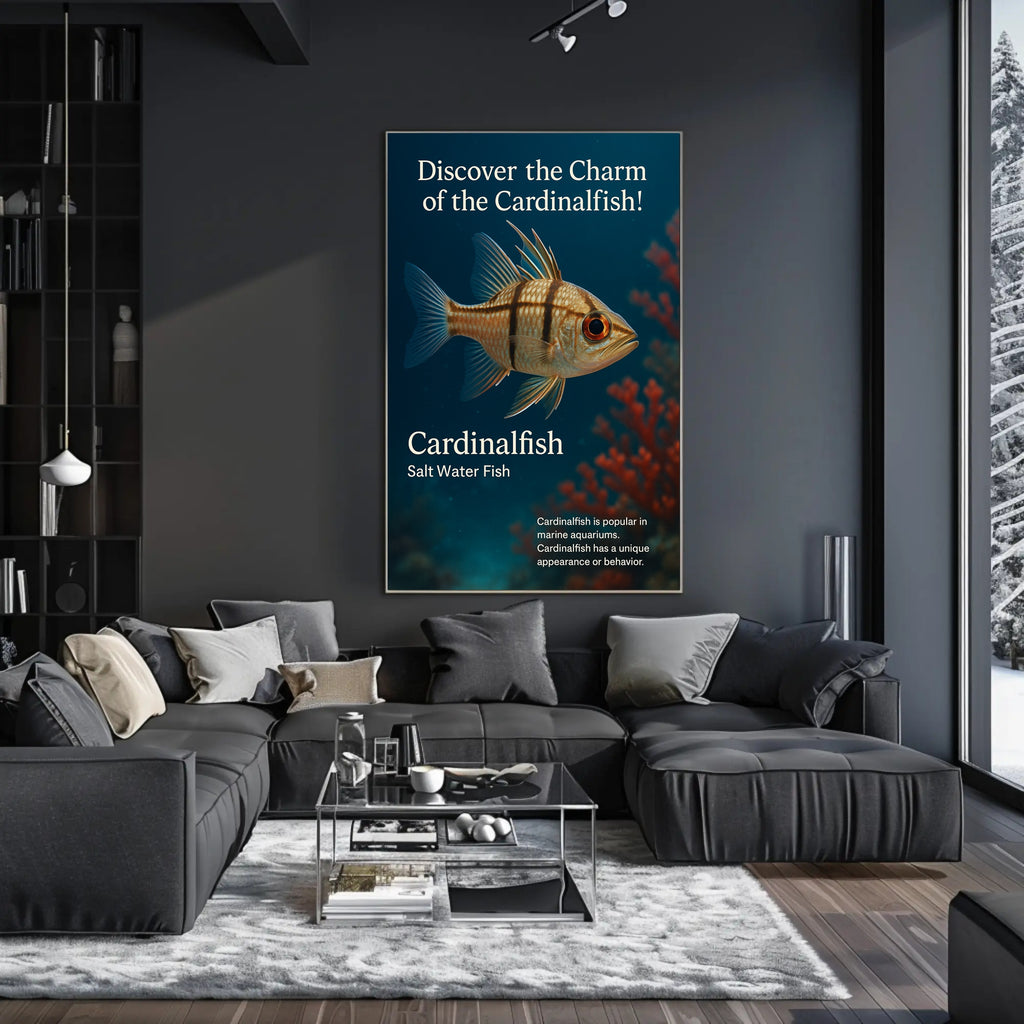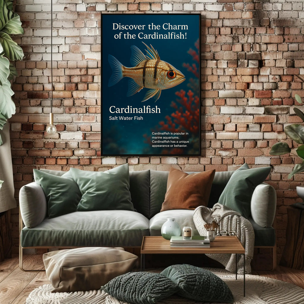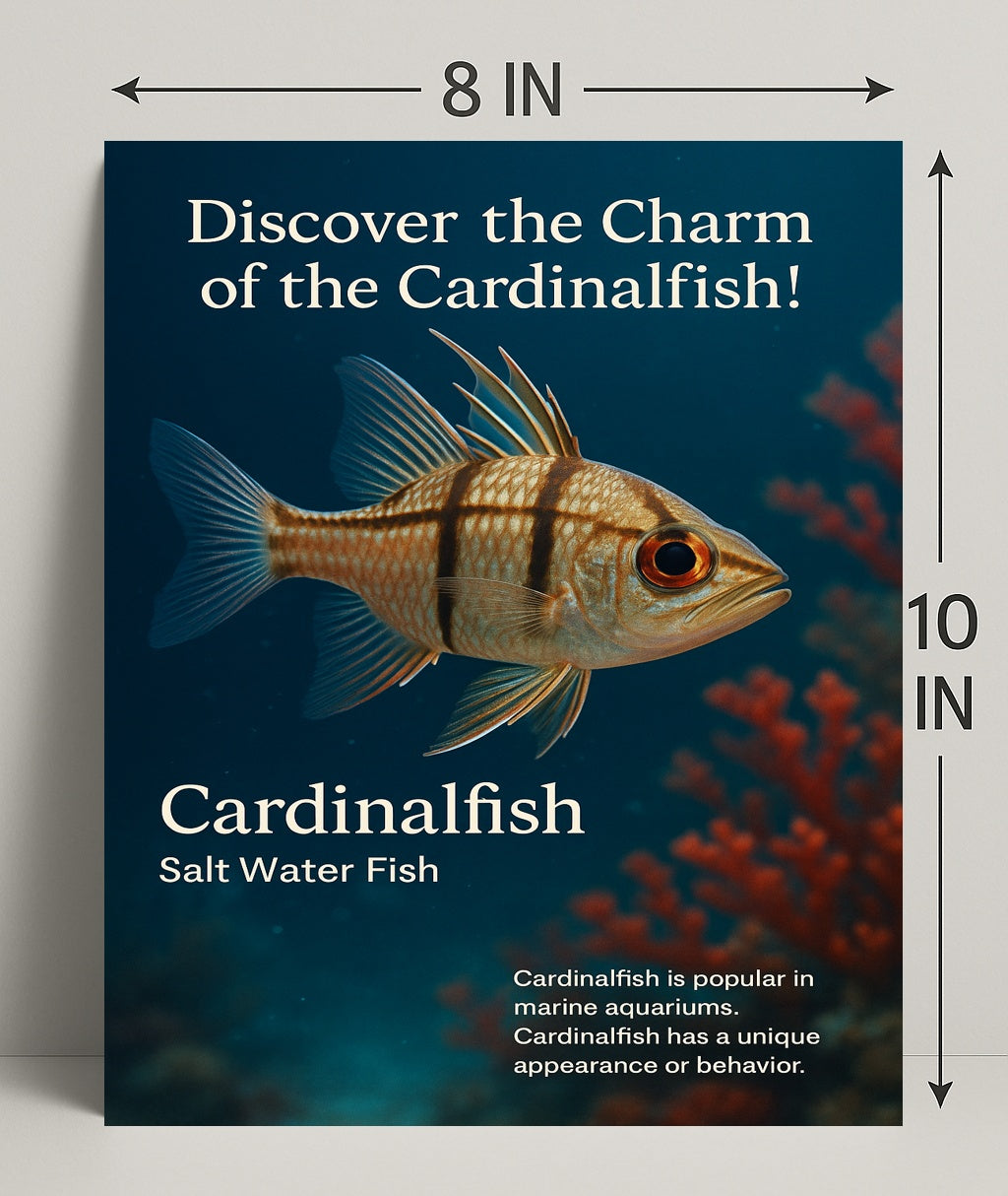 Bring the ocean home with PosterGoat’s “Discover the Charm of the Cardinalfish” poster — a striking art print that captures a detailed cardinalfish floating against a deep-blue seascape with soft coral bokeh. Its lifelike texture, warm amber eye and delicate fin outlines create a calming focal point for living rooms, offices, nurseries or marine-themed spaces.