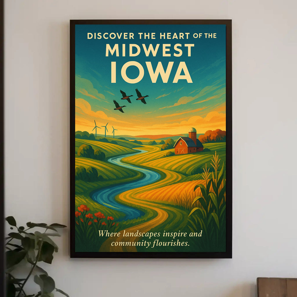 Bring the charm of the Midwest into your home with the "Discover The Heart Of Iowa" poster by PosterGoat. This scenic art print captures a sunlit, rolling landscape—winding river, golden crop rows, a classic red barn, distant wind turbines and migrating birds—rendered in a warm, vintage-inspired palette that complements minimalist and travel-themed decor.