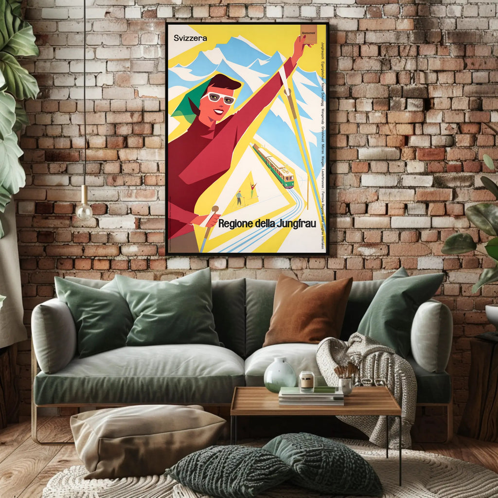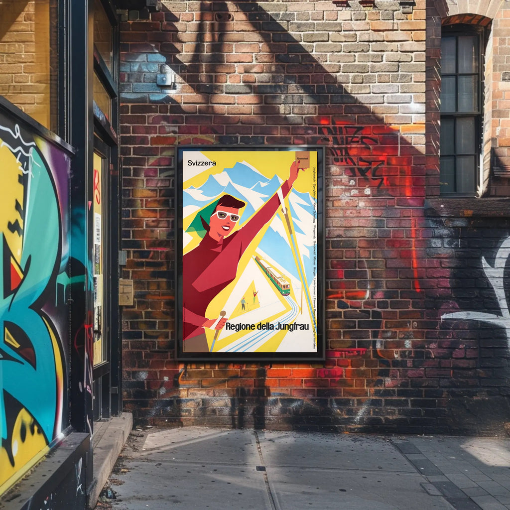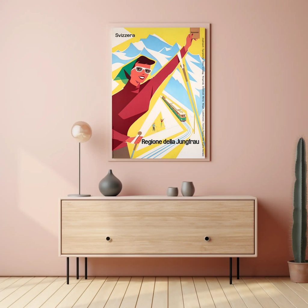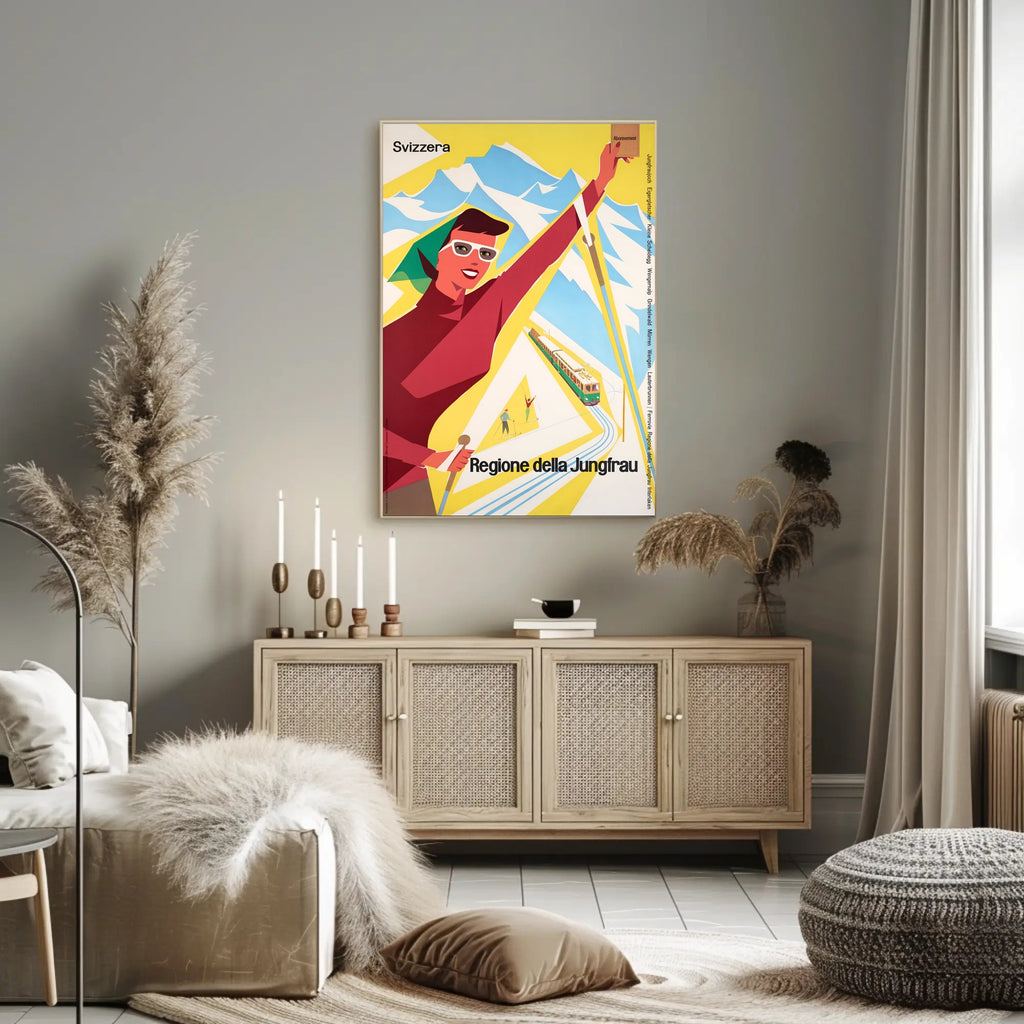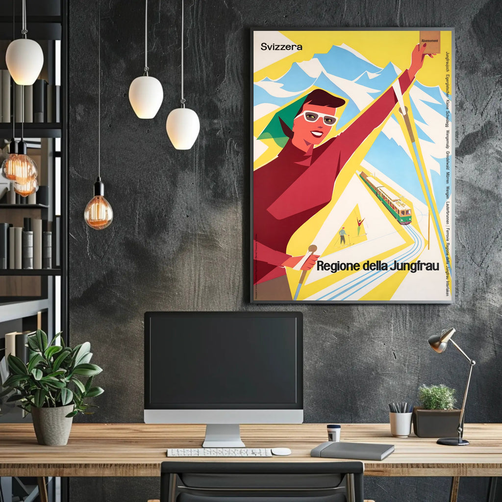 Discover the Jungfrau Region Poster from PosterGoat transforms any wall into a celebration of alpine adventure. This vintage-inspired travel print channels mid-century charm with bold, minimalist shapes — a smiling skier, a scenic mountain range, and a classic rack railway rendered in vibrant yellow, red and sky-blue tones. Perfect for decor lovers, wanderlust spirits, and collectors of scenic souvenirs.