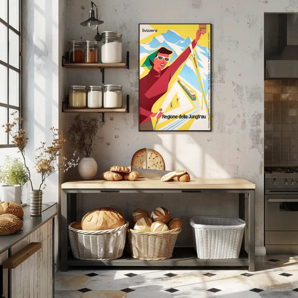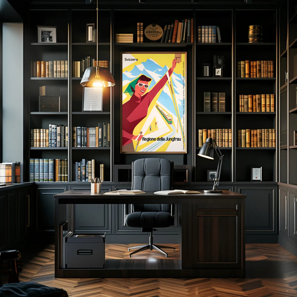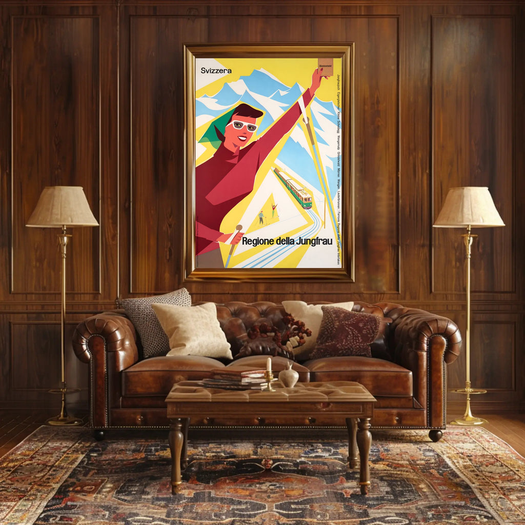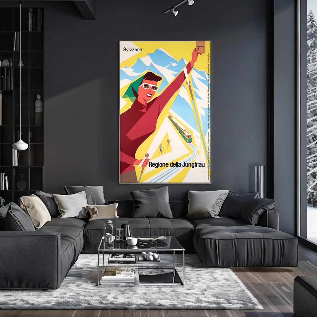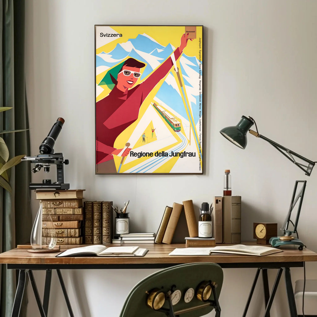 Discover the Jungfrau Region Poster from PosterGoat transforms any wall into a celebration of alpine adventure. This vintage-inspired travel print channels mid-century charm with bold, minimalist shapes — a smiling skier, a scenic mountain range, and a classic rack railway rendered in vibrant yellow, red and sky-blue tones. Perfect for decor lovers, wanderlust spirits, and collectors of scenic souvenirs.