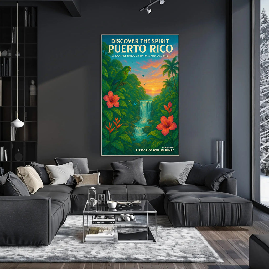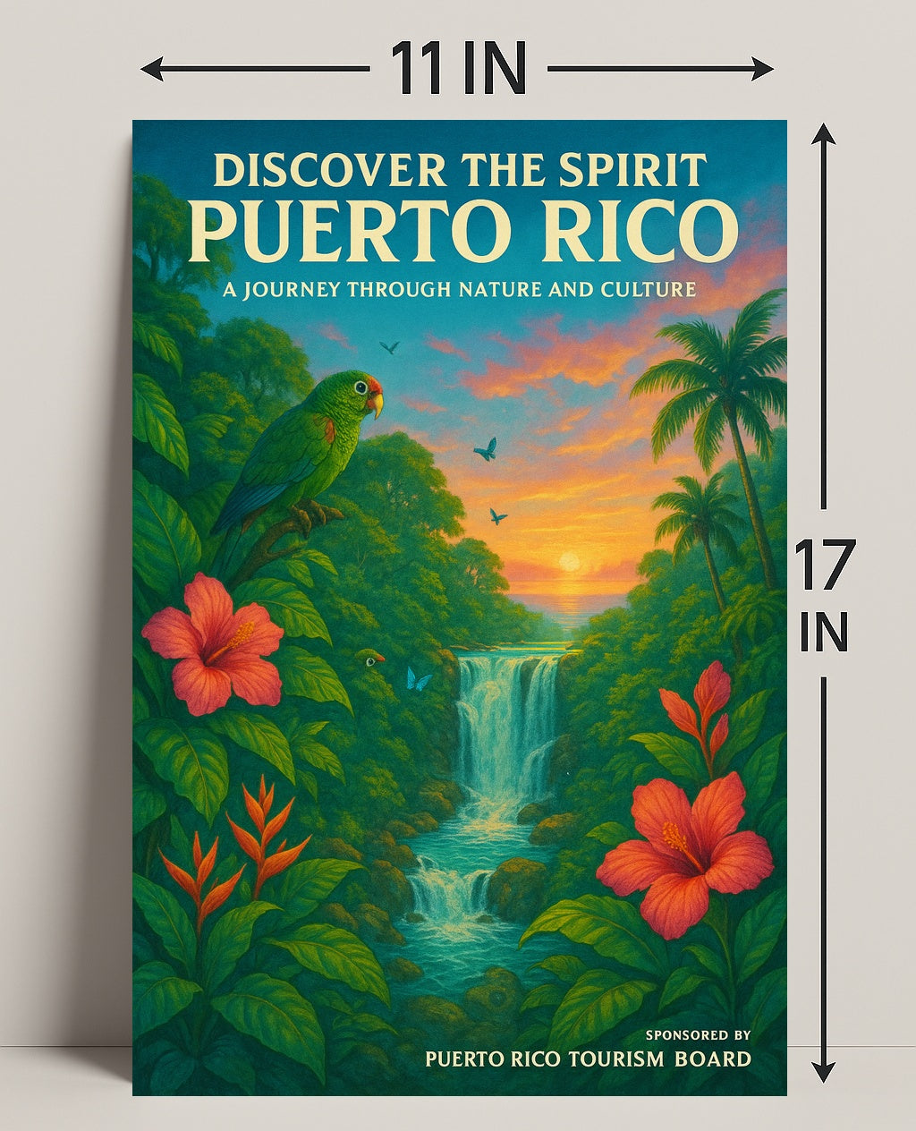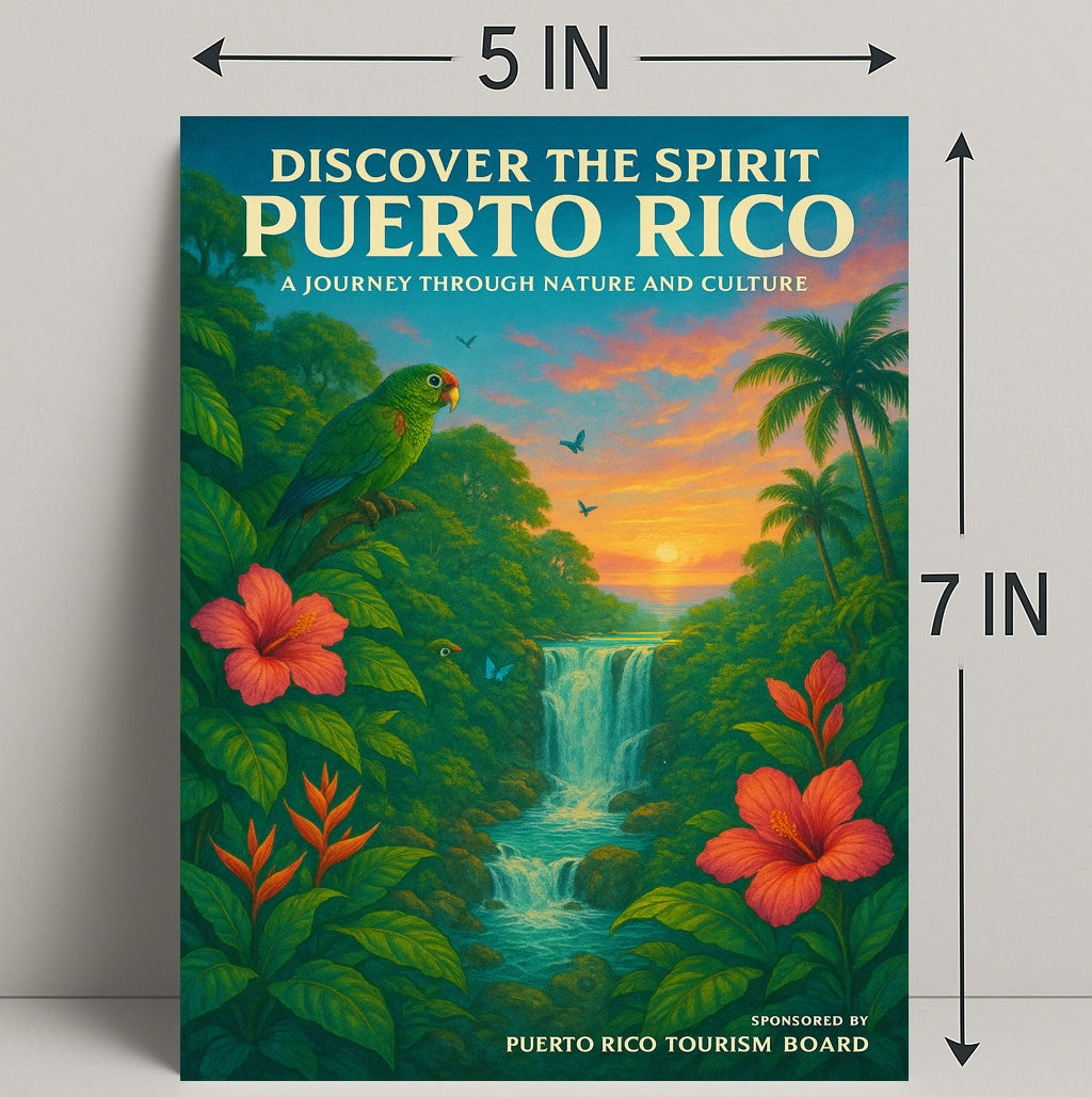Bring the vibrant heart of the Caribbean into your home with the "Discover The Spirit Of Puerto Rico" poster from PosterGoat. This scenic travel-style print captures a lush tropical valley framed by hibiscus blooms, graceful palm silhouettes, a cascading waterfall and a sunset sky—complete with a colorful parrot and butterflies that invite you into a journey through nature and culture.
