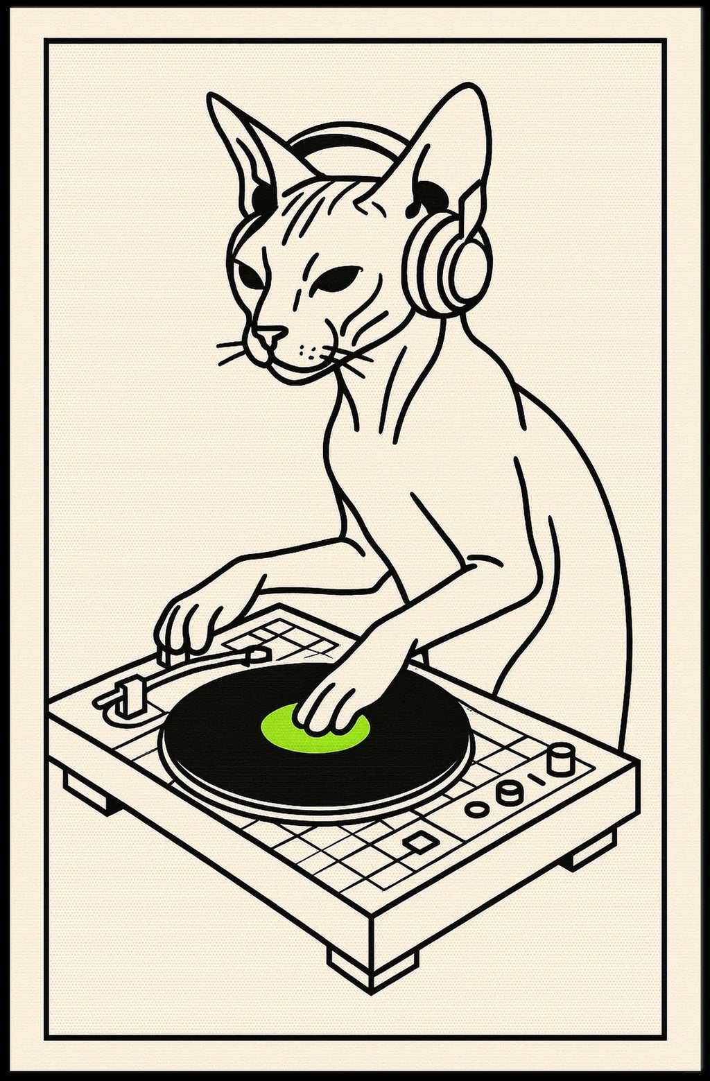 - Detailed design highlighting the fusion of a DJ-cat motif with wanderlust-inspired scenery