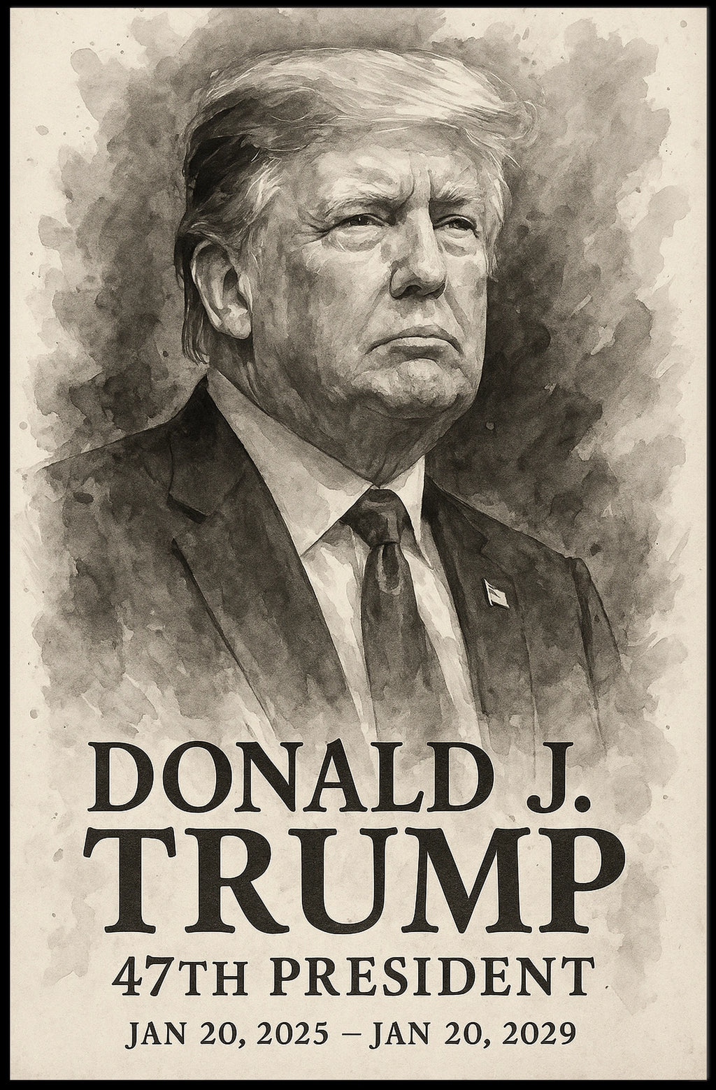 - Detailed design highlighting Donald J. Trump as the 47th President