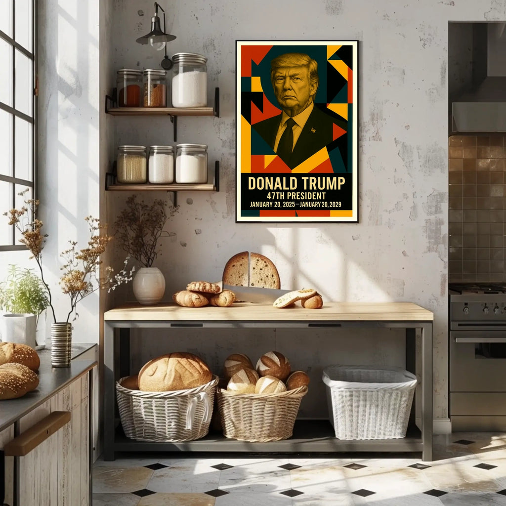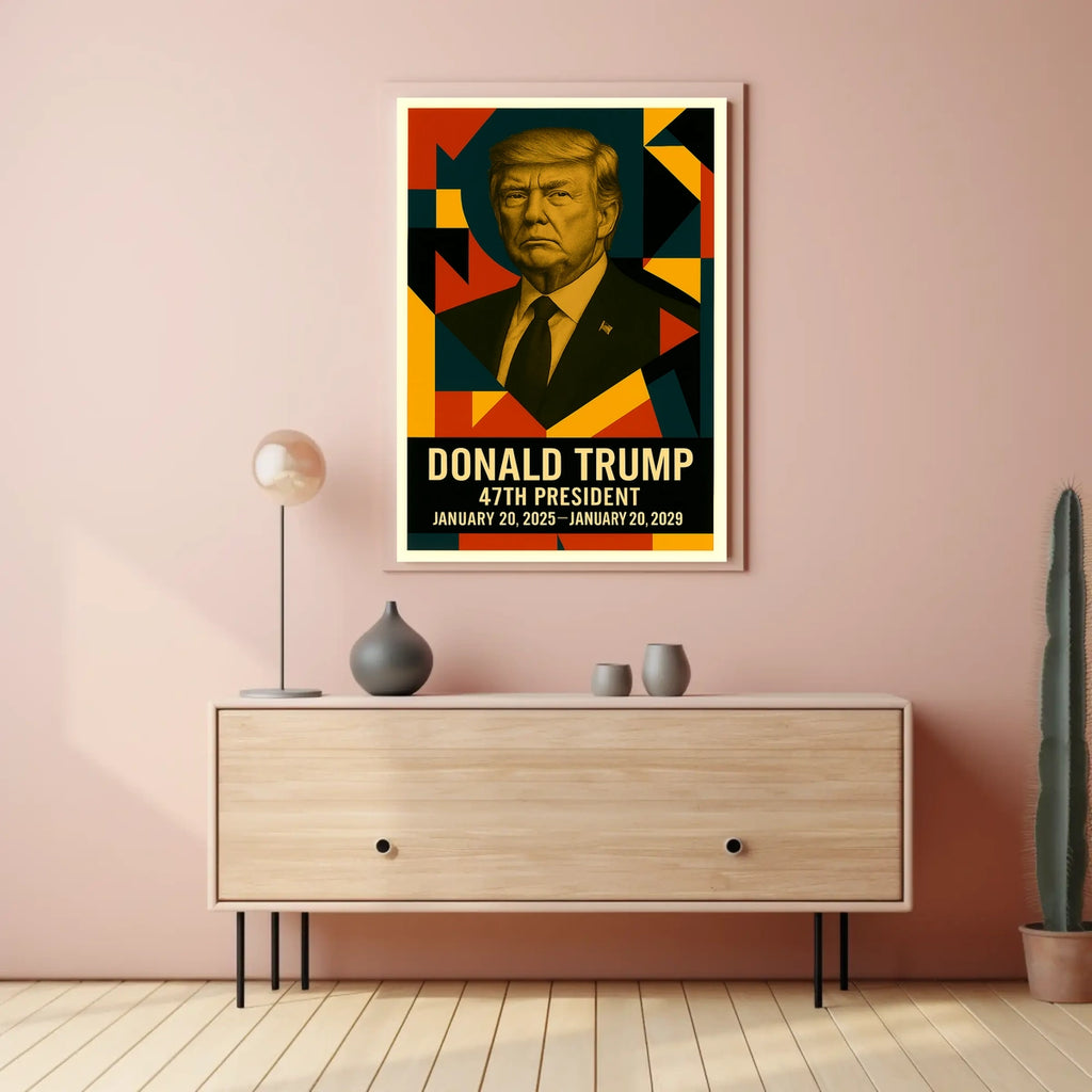 This abstract pop poster features Donald Trump, the 45th President. The composition emphasizes clean lines and a simplified silhouette for wall display in homes and offices. It aligns with poster-style wall art and home decor themes.