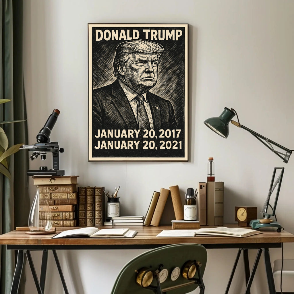 Enhance your wall with a bold black-and-white comic sketch poster featuring a prominent U.S. political figure who served as the 45th president. This striking piece blends classic line art with a pop-art influence, making it a compelling addition to any home or office decor.