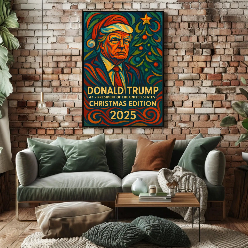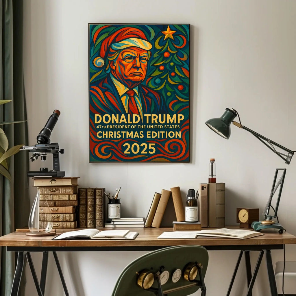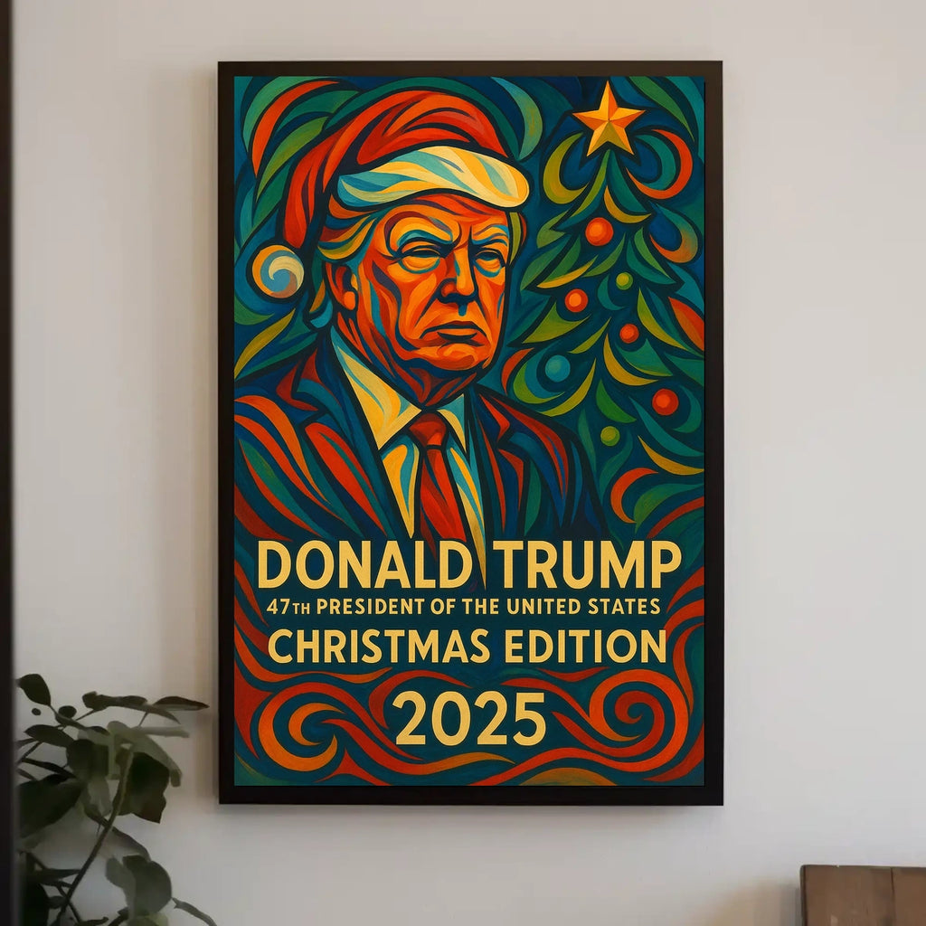 Capture the festive season and political history with this unique Christmas Edition poster featuring Donald Trump portrayed as the 47th President of the United States. Sporting a Santa hat, this artwork combines holiday cheer with political commentary, making it perfect for collectors and admirers of presidential history alike. Its bold design brings a lively touch to your seasonal décor or political memorabilia collection. Enhance your space with its vibrant aesthetic and make a powerful statement. Ideal for Christmas enthusiasts and Donald Trump fans, this poster transforms any room into a conversation starter.