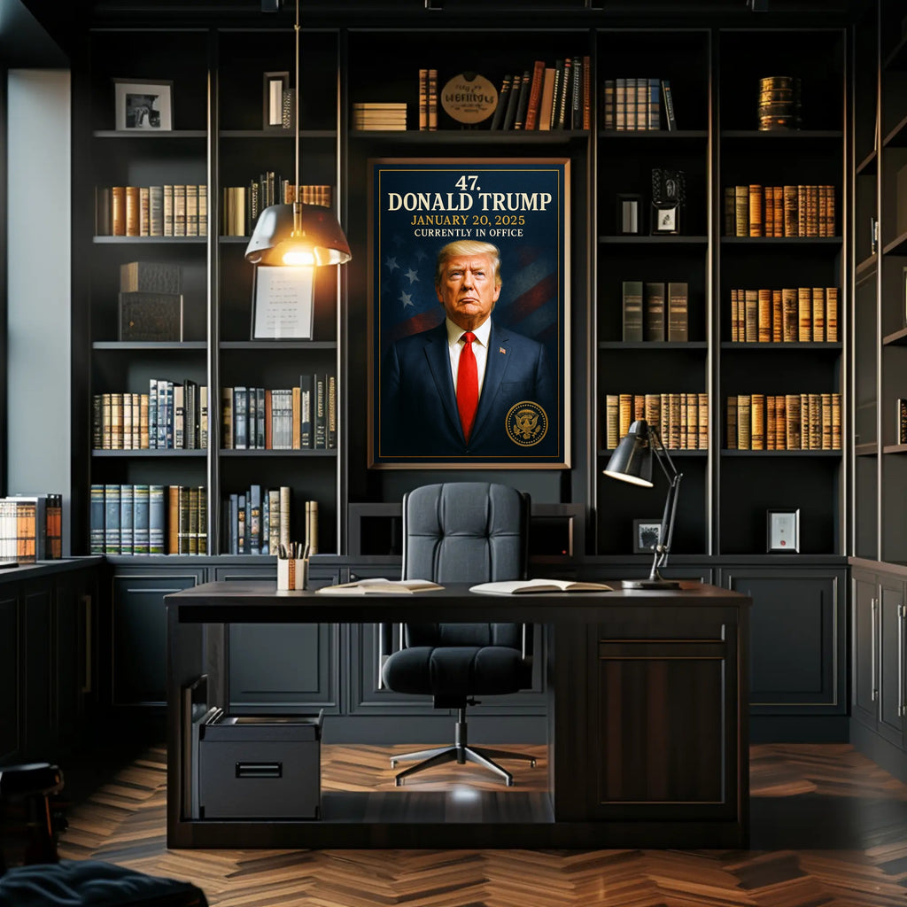 Elevate your Home & Garden decor with the Donald Trump 47th President Poster from PosterGoat — a bold, museum-style art print that combines presidential gravitas with premium poster craftsmanship. This striking 18x24 poster features a commanding portrait composition, deep navy background with subtle flag motifs, gold-accented typography and seal, and a timeless framed look that makes a memorable focal point in any room.