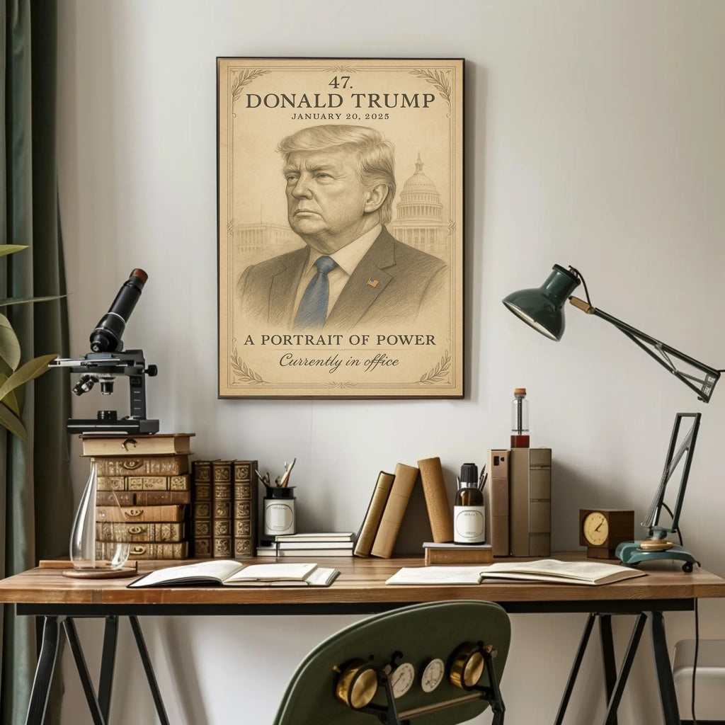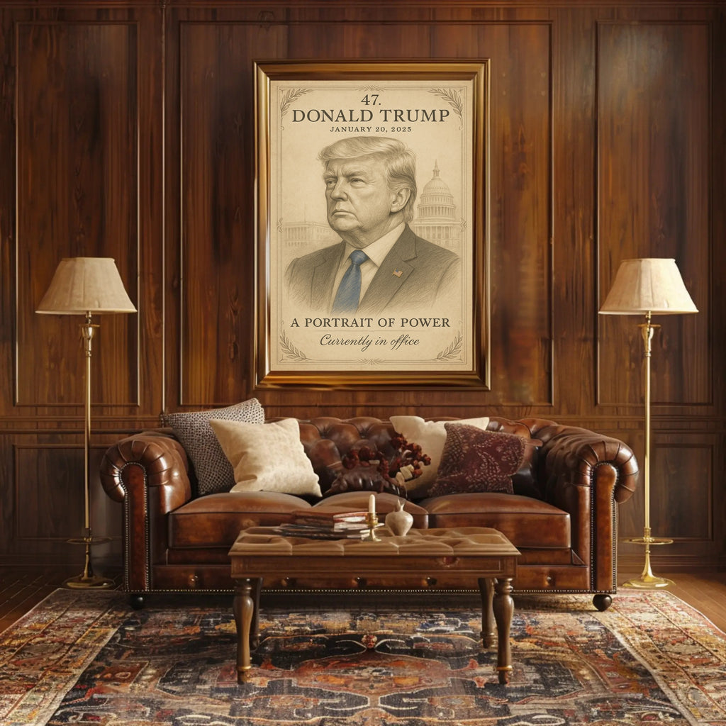 Donald Trump 47th President Poster from PosterGoat is a striking, museum‑style print that blends classical portraiture with bold political symbolism. Rendered in a sepia pencil‑sketch aesthetic, this 18x24 poster captures a dignified likeness set against faint architectural sketches of the Capitol — an ideal centerpiece for home, office, or political decor.