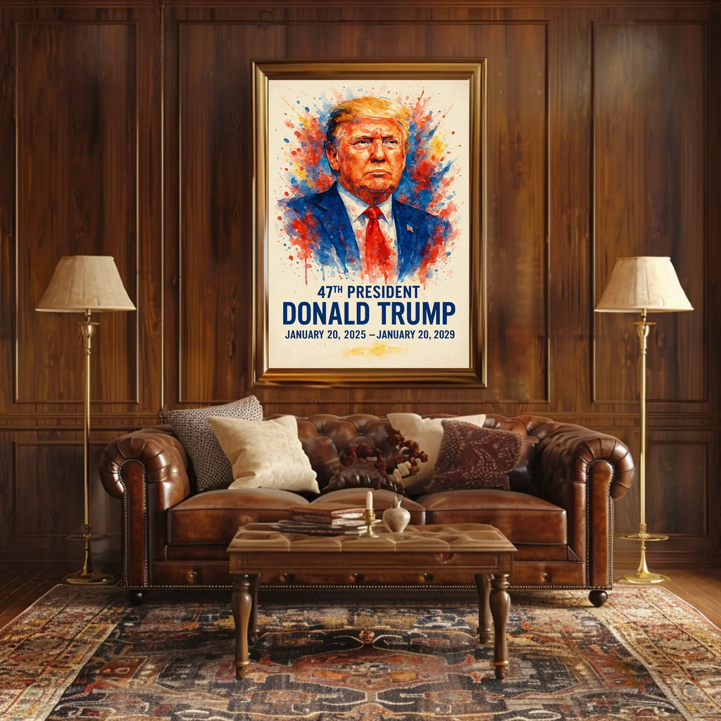 Designed as a tribute to leadership and transformation, this poster blends dynamic watercolor artistry with the formal poise of a presidential portrait. The red, white, and blue palette echoes patriotic spirit and contemporary design, making it a perfect decor piece for fans of modern art, collectors of political art, and anyone who values innovation and decisive leadership.
