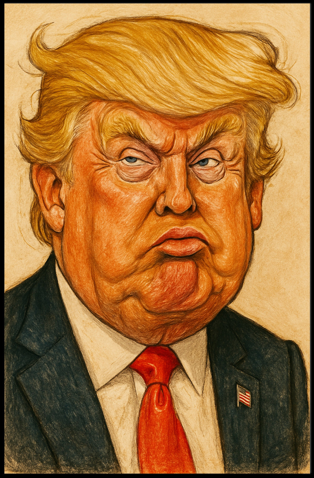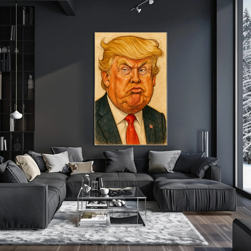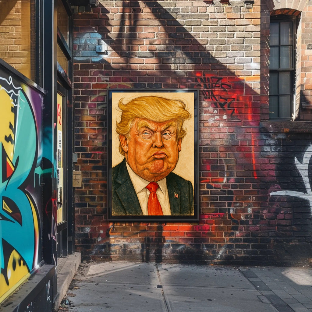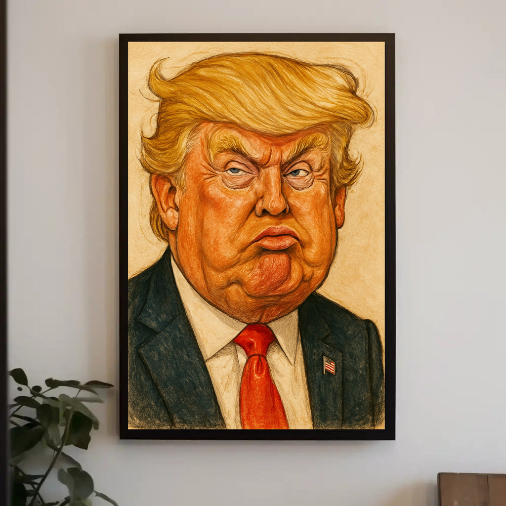 This bold Donald Trump caricature poster from PosterGoat turns political commentary into eye-catching wall art. Rendered in pop art–inspired caricature style, the exaggerated features and textured pencil-like strokes deliver comic satire with a contemporary edge — a true statement piece for home, office, or gallery-style decor.