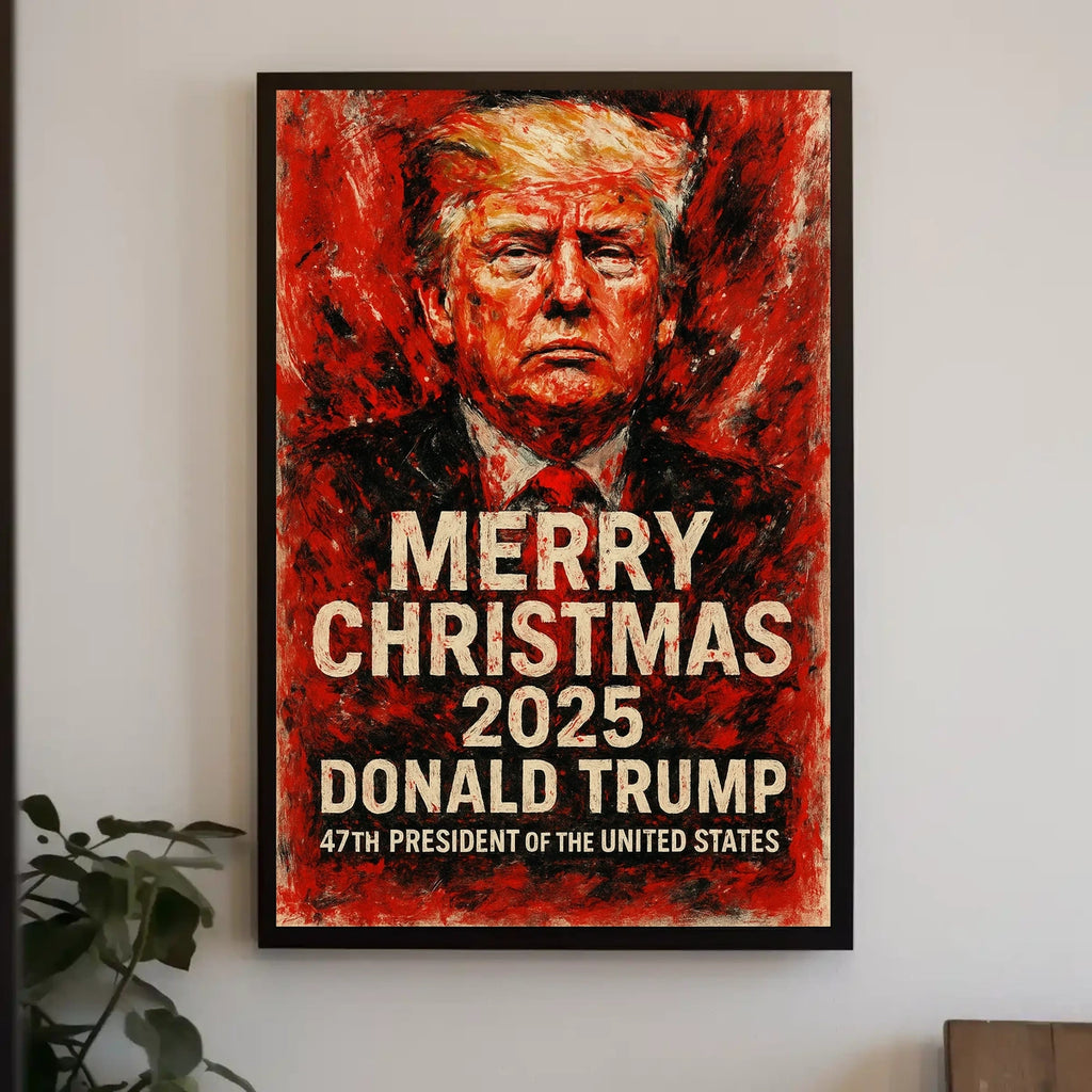 Immerse in the festive spirit with a bold and dramatic Christmas poster highlighting the stylized portrait of Donald Trump against a striking red and black background. Celebrating his projected 2025 tenure as the 47th President of the United States, this artwork melds a painterly style with powerfully themed propaganda aesthetics indicative of a memorable historical moment. Perfect for political enthusiasts, America memorabilia collectors, or anyone looking to add an iconic and spirited touch to their holiday decor. This poster serves as a conversation starter and a perfect decorative piece for those who appreciate political history and impactful artistic statements.
