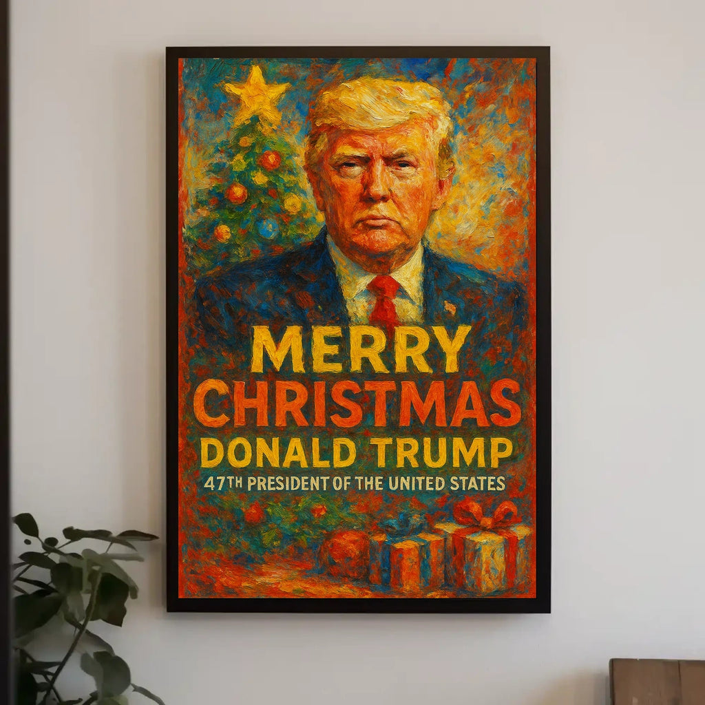 Celebrate the holidays with this captivating and bold Christmas-themed poster featuring a stylized depiction of former President Donald Trump. Showcasing the message "MERRY CHRISTMAS" and "DONALD TRUMP 47TH PRESIDENT OF THE UNITED STATES," this poster exudes an aura of festivity and patriotism. Its vivid colors and striking graphics create a unique visual interplay that will command attention as a centerpiece of holiday cheer. Beyond its seasonal appeal, it offers a tongue-in-cheek nod to the political landscape, perfect for collectors of presidential paraphernalia or those seeking a standout piece for their seasonal décor.