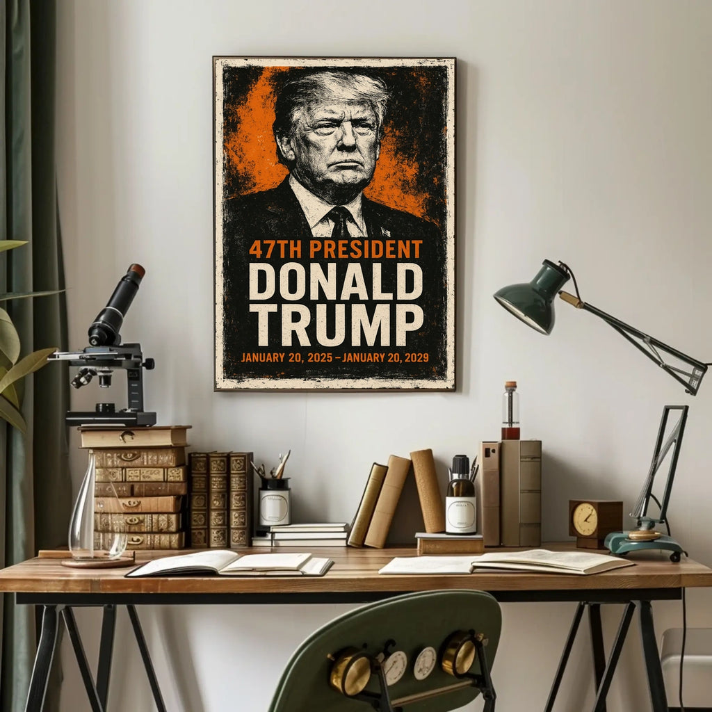 With a textured grunge border that lends timeless, vintage appeal, this poster merges bold political art with modern styling. The orange-and-black palette elevates the authoritative presence, inviting viewers to reflect on leadership, legacy, and the impact of American discourse. A standout piece for any space that values patriotism, history, and striking visual storytelling.