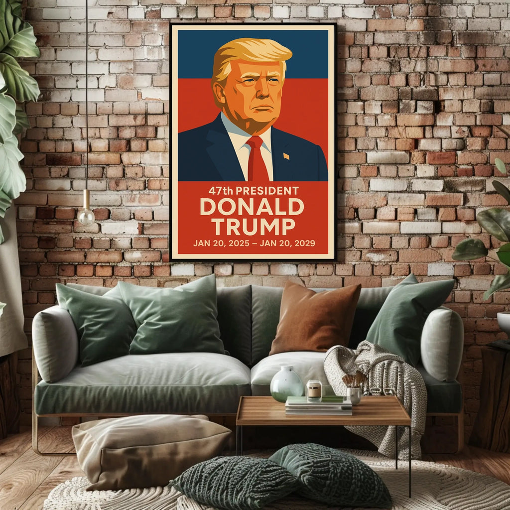 Featuring bold, graphic lines and a patriotic triad of red, white, and blue, this artwork channels the vintage essence of political propaganda while celebrating leadership and American history. Trump stands prominently, facing forward with an expression of determination, embodying a spirit of leadership as the 47th President. The minimalistic background allows the subject's authority to take center stage.