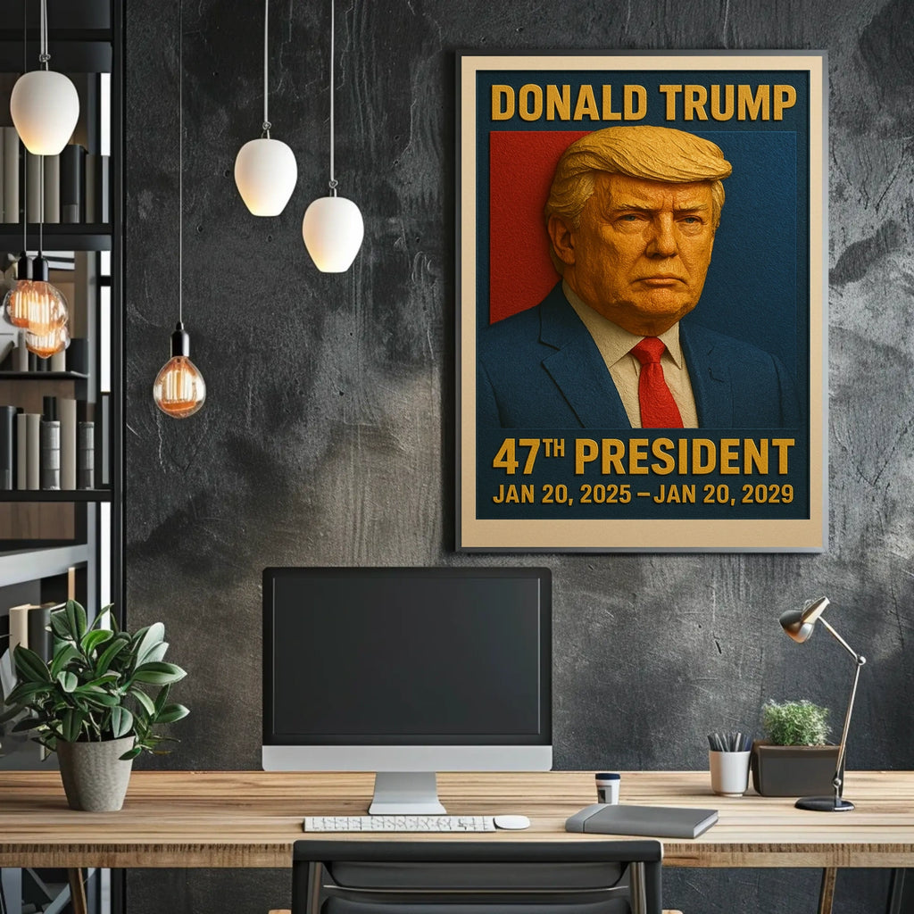 A captivating and artistic rendering, this poster captures Donald Trump as a visionary leader, poised at the outset of a transformative journey. Dressed in a classic blue suit and signature red tie, he stands against an abstract, vibrant background that symbolizes his path toward historical legacy. His gaze is steadfast, projecting an aura of resilience and unyielding ambition. The embossed effect emphasizes his larger-than-life persona, making this piece a striking tribute to presidential leadership and the indomitable spirit that defines his tenure. Perfect for admirers of political history and American heritage.