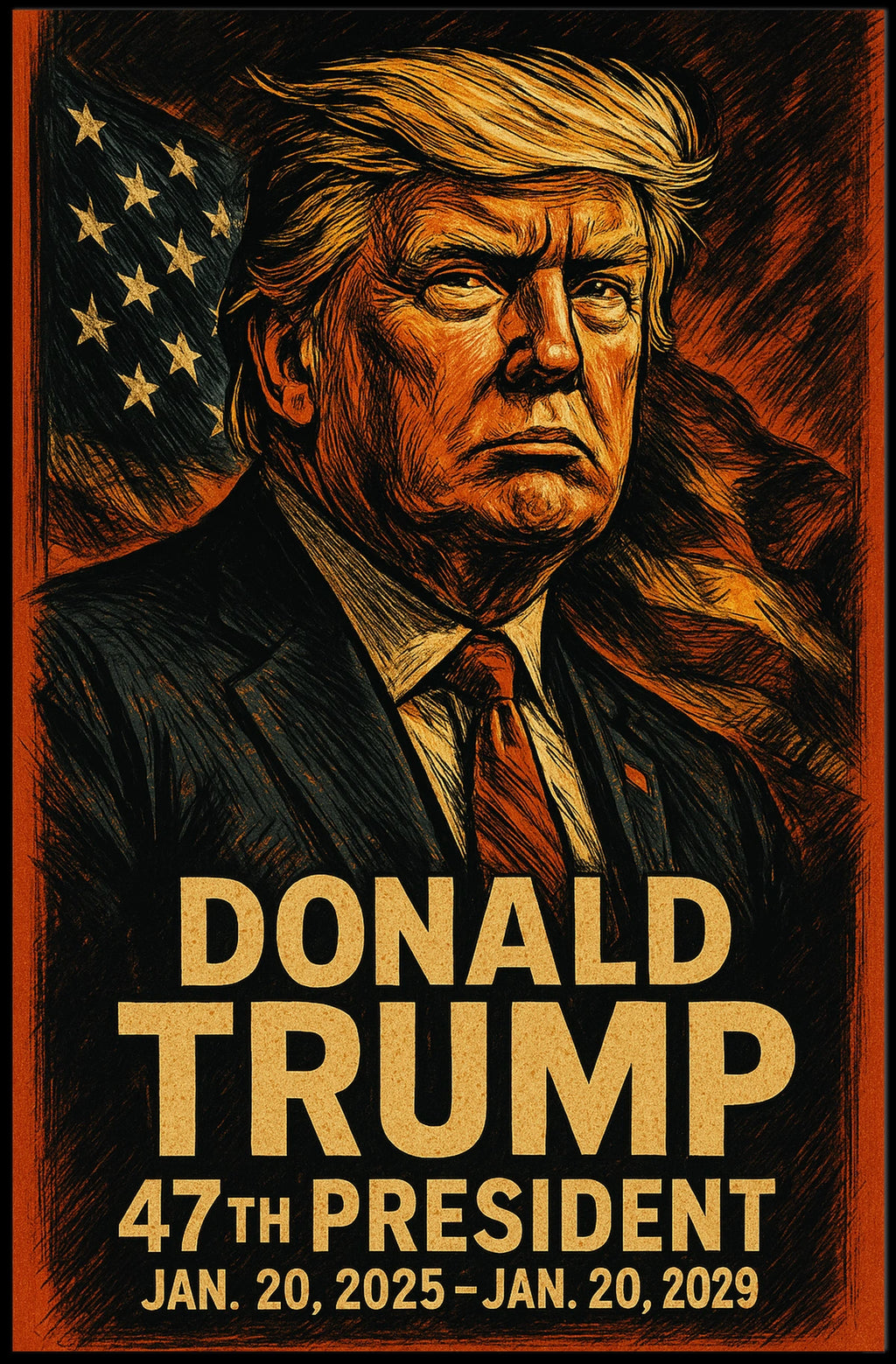 This evocative art print captures President Donald Trump as a sentinel of American values, his determined gaze fixed steadfastly ahead. Cloaked in a tapestry of rich reds and deep blues, the poster pays homage to the indomitable spirit of leadership. In the backdrop, a reimagined American flag flows majestically, symbolizing resilience and power. The artwork blends classic portraiture with bold contemporary strokes, culminating in a timeless piece that pays tribute to the enduring narrative of vision and tenacity. The dramatic lighting and textured details invoke a sense of dignity and patriotic fervor, anchoring this iconic moment in time.