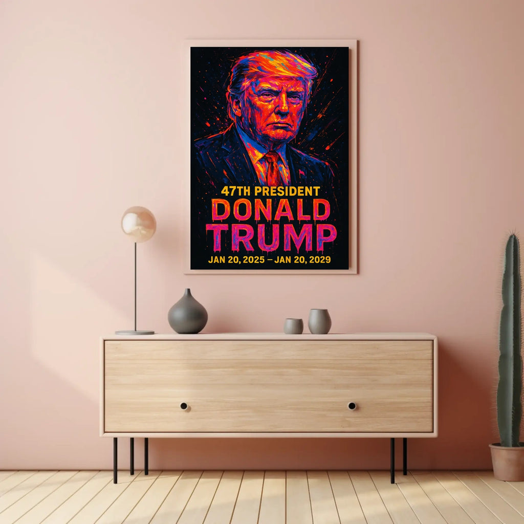 A stunning portrayal of President Donald Trump where contemporary art meets historical significance, this poster captures Trump in a moment of sheer determination, his steely gaze fixed on the future. Surrounded by an ethereal glow of neon blues and fiery reds, this artwork exudes a modernist touch yet retains the gravitas of its subject. The energetic background suggests rapid evolution—a nod to Trump's transformative influence on the political landscape. This piece is both a tribute to his unwavering tenacity and a reflection on the era-defining changes he inspired, making it a must-have for collectors.