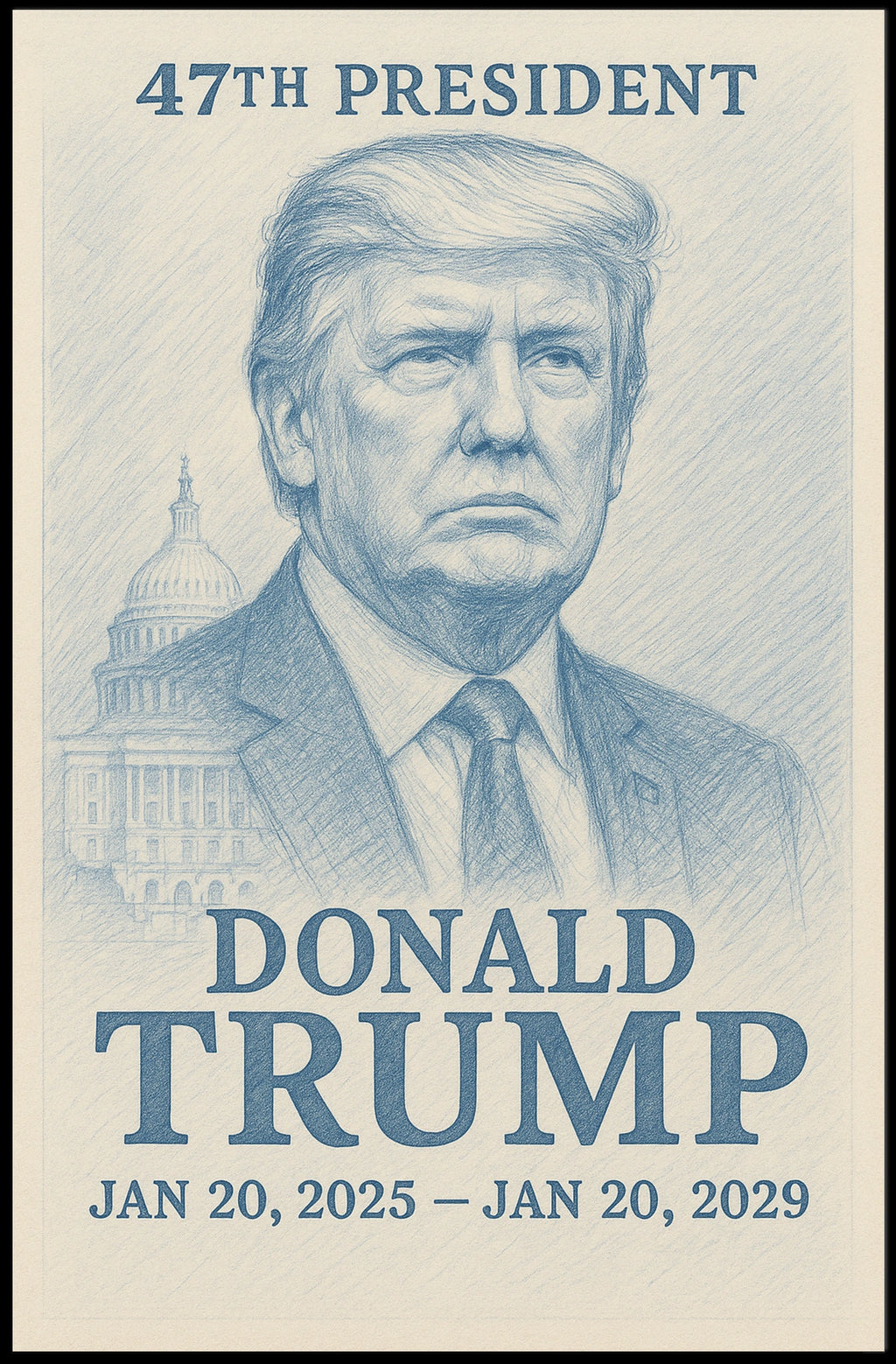 This evocative portrait of Donald Trump captures the essence of his leadership at a pivotal moment in American history. Rendered in intricate pencil sketch style, the artwork highlights Trump's unwavering determination. The backdrop of the U.S. Capitol building serves as a reminder of his role in shaping national policy. The powerful composition is both a tribute to his presidential tenure and a reflection on governance. Smoky shading adds a layer of depth, while his focused expression is artfully captured, making it a truly captivating piece for any admirer of political history.