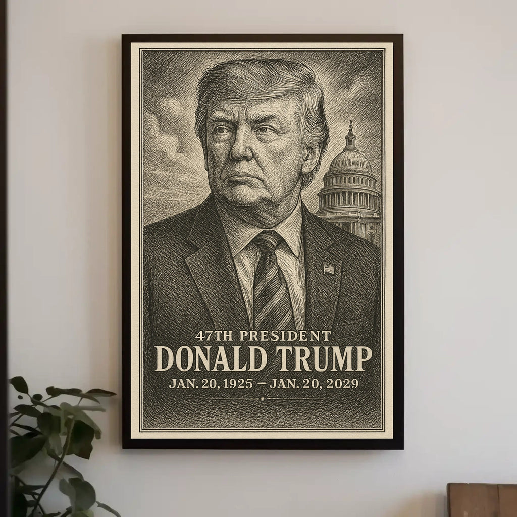 In this evocative art piece, President Donald Trump stands resolute against a dramatic sky, embodying the spirit of relentless determination. The engraved-style portrait showcases Trump in a moment of intense concentration, his gaze fixed forward, suggesting a vision of progress. Behind him, the U.S. Capitol looms large, signifying governance and national duty. This print blends historical and contemporary aesthetics, weaving a narrative of a leader unwavering amidst challenge. The surrounding stars and stripes subtly reinforce a theme of unyielding patriotism, making this piece a fitting tribute to Trump's enduring influence on American politics.
