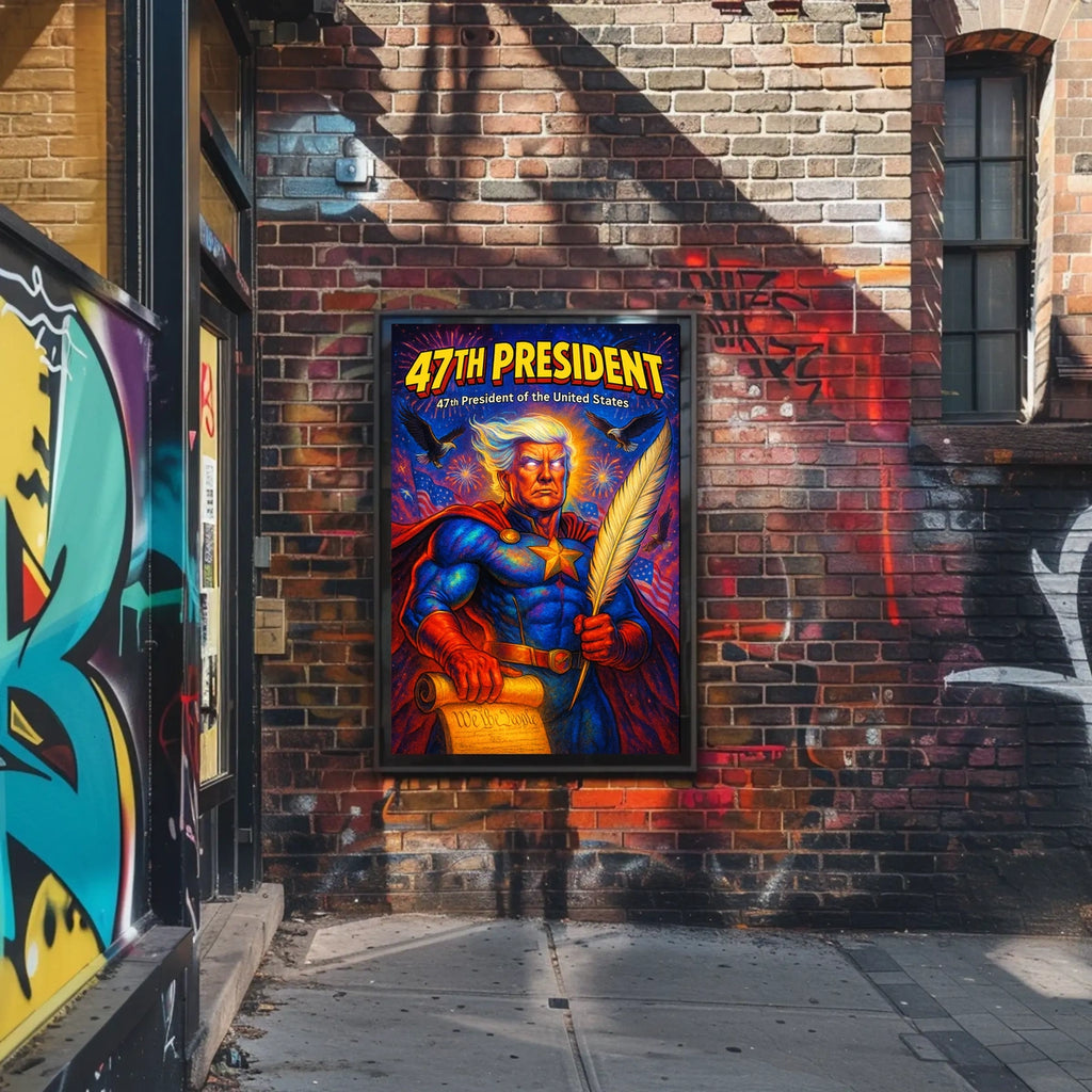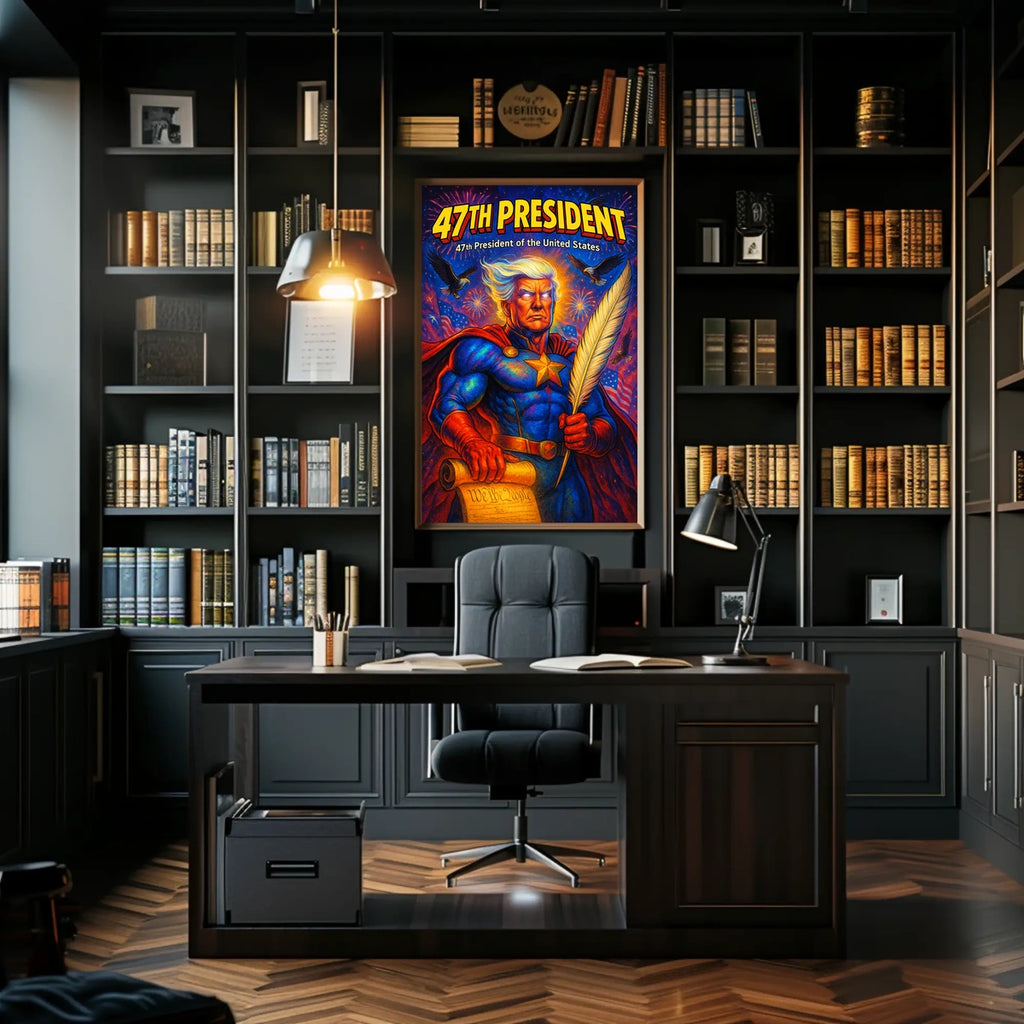 In a bold and electrifying portrayal, this poster captures President Donald Trump as the ultimate patriot's champion. Adorned in a superhero costume, complete with a majestic cape and glowing eyes, he stands amidst a scene of vibrant fireworks and American eagles soaring high. Each brushstroke echoes themes of power and leadership, as he grips a grand quill, ready to mark history with decisive strokes. This composition is a celebration of resilience and national pride, highlighting Trump's unwavering dedication to his country and its values. A must-have for any true patriot's collection.