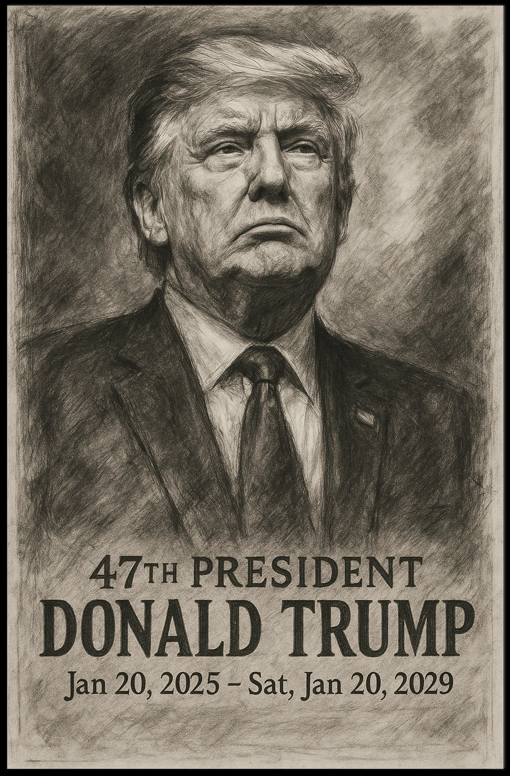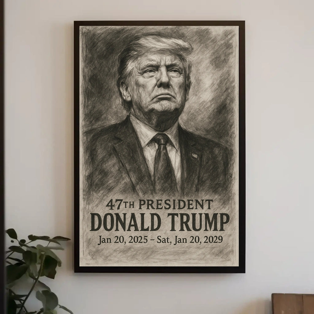 This striking portrait captures President Donald Trump as a personification of unwavering determination and strength. The artist employs a masterful blend of charcoal and shadows to highlight his resolute gaze and the fine lines of his face, set against a textured backdrop that suggests the complexities of his tenure. The monochrome style amplifies the gravity of his presence, while the historic text below serves as a testament to his role in modern American history. This artwork is a compelling choice for those who appreciate leadership forged in the crucible of time.