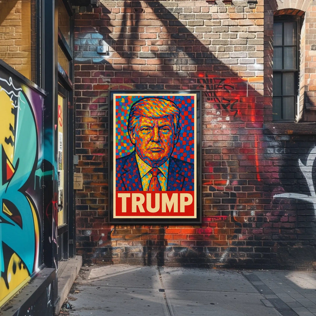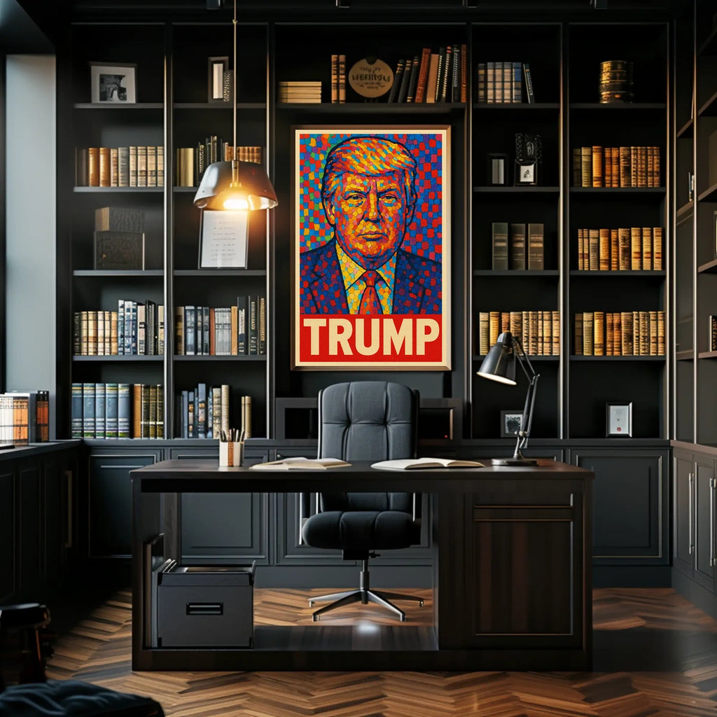 This striking art print of President Donald Trump captures his indomitable spirit through a vivid, energetic mosaic. The artwork uses a bold checkerboard pattern to bring out the intensity of Trump’s gaze, rendered in a pop art style that balances between historic representation and avant-garde abstraction. The contrasting hues emphasize his iconic features, creating a piece that is both a celebration of his persona and a commentary on his impactful legacy. Bursting with color and dynamism, this poster honors the complexity and larger-than-life presence of a polarizing and influential leader.